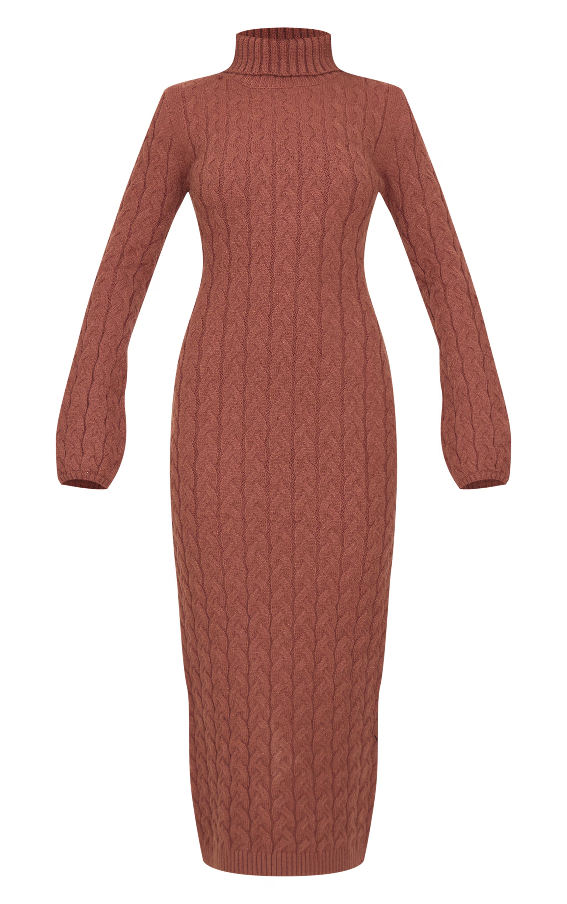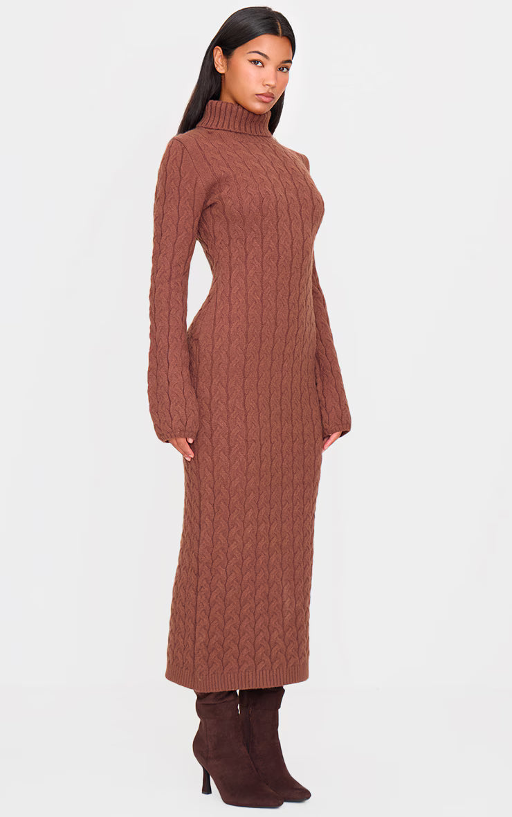 Cappuccino Chunky Cable Knit Roll Neck Maxi Sweater Dress