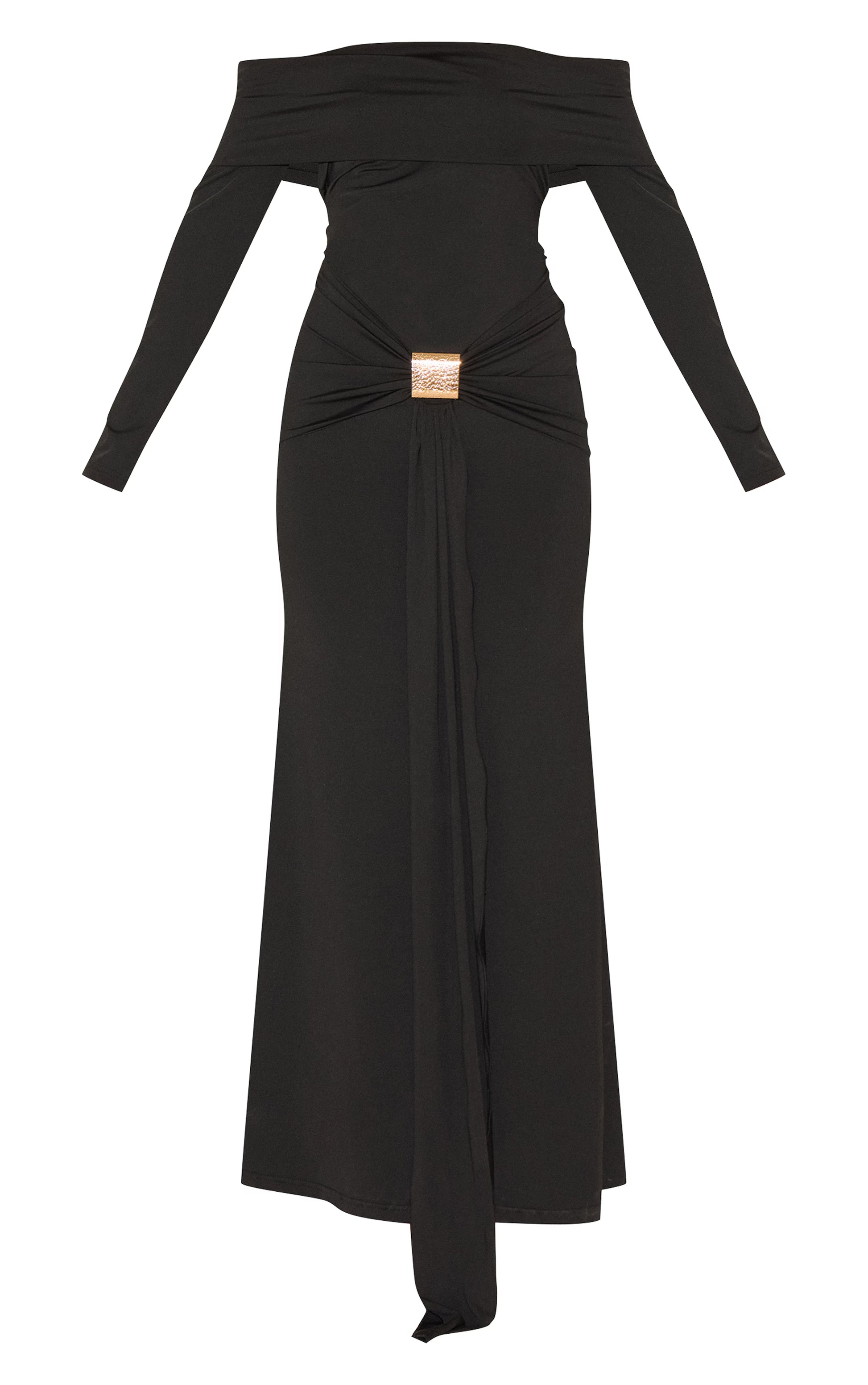 This black bardot long sleeve trim drape detail maxi dress brings an elevated finish to any look, crafted from a black material with a bardot neckline, a gold accented belt and feminine draping. Just add classic stilettos, gold earrings and a simplistic black shoulder bag.