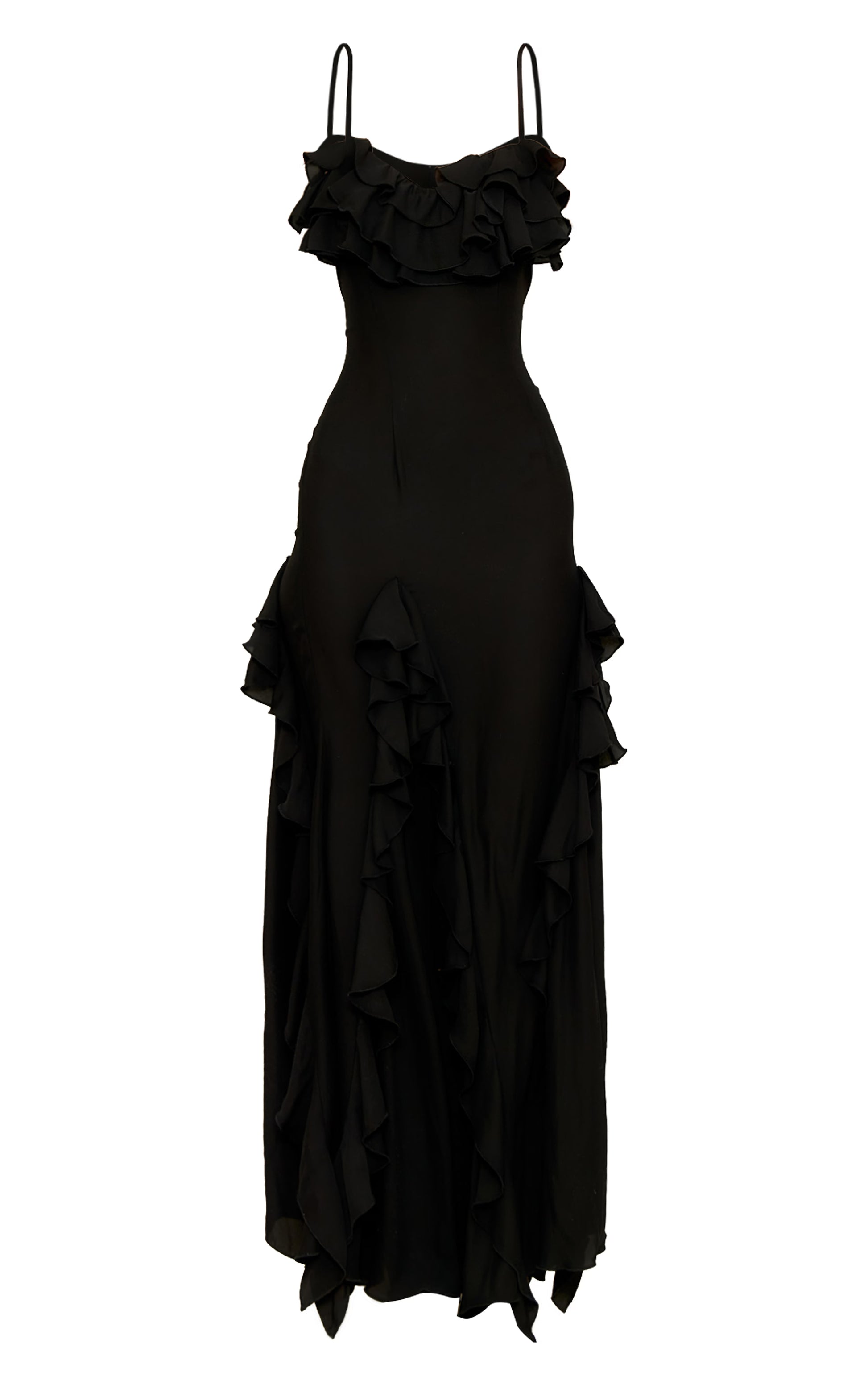 Uncover the essence of luxury with this black frill cup detail maxi dress. Delicately detailed with intricate ruffling, this dress has adjustable spaghetti straps and an elegant maxi length fit. Bring all the drama by styling it with barely-there strappy stiletto heels and oversized stud fastening gold earrings.
