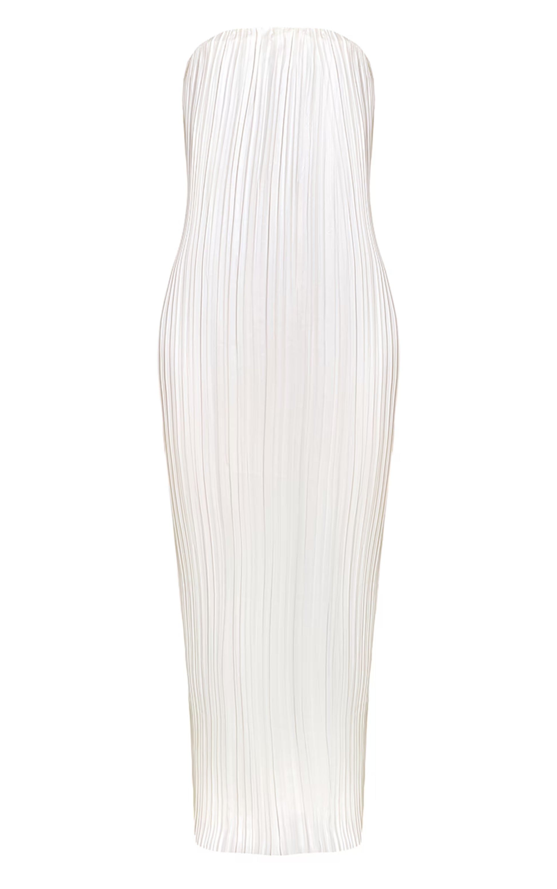 PLT Label Ivory Plisse Satin Column Bandeau Maxi Dress