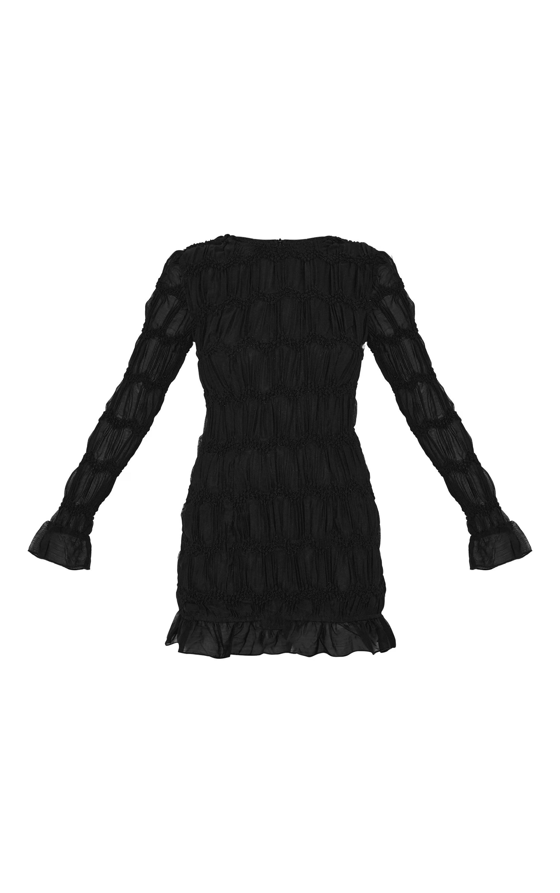 Black Textured Long Sleeve Crew Neck Mini Dress