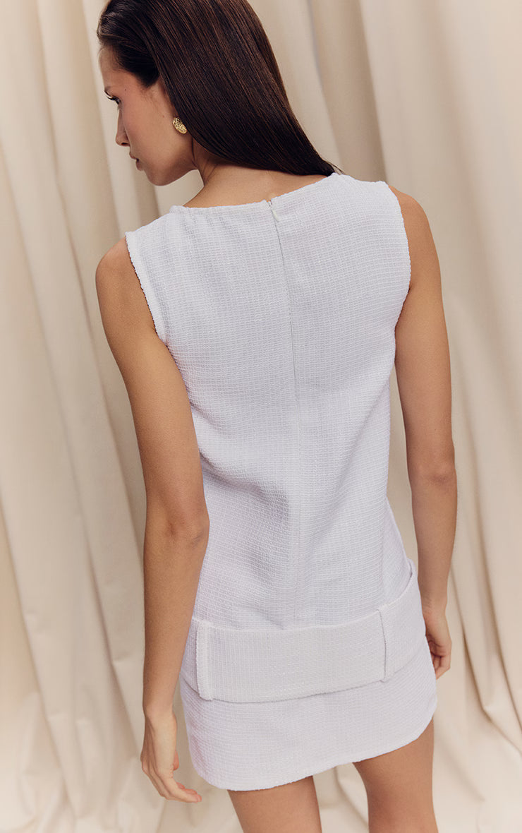 Brought to you in a white boucle material with a flattering oversized fit, a low belt detail and a shift design. Team this white boucle oversized low belt shift dress with a pair of slip-on heels and your favorite accessories for a statement finish.