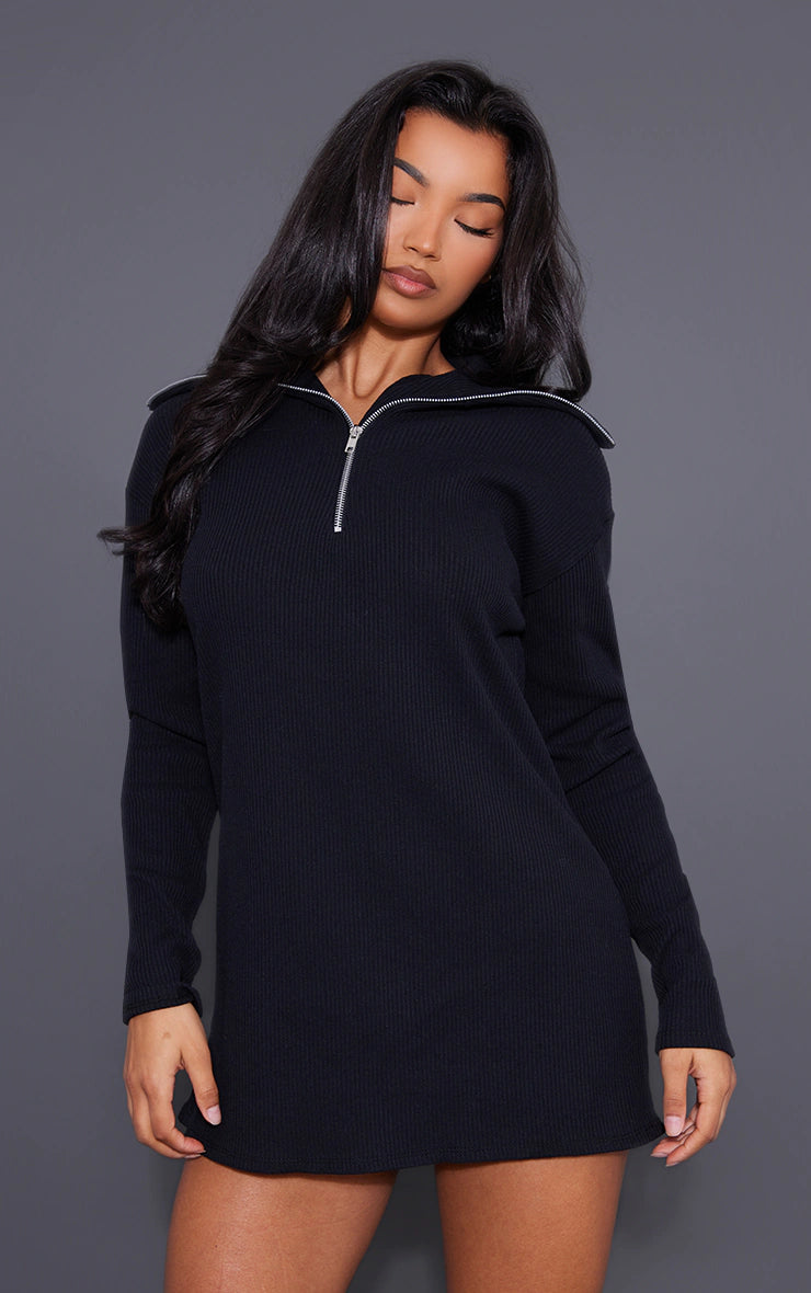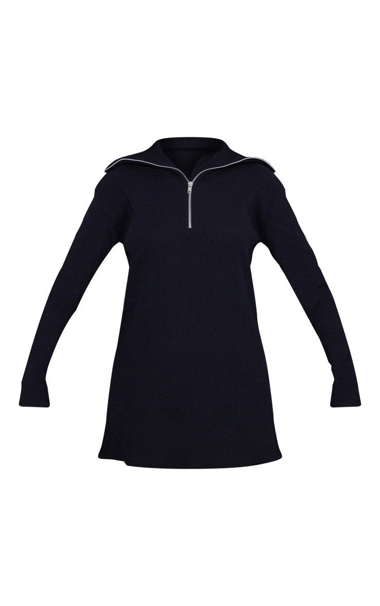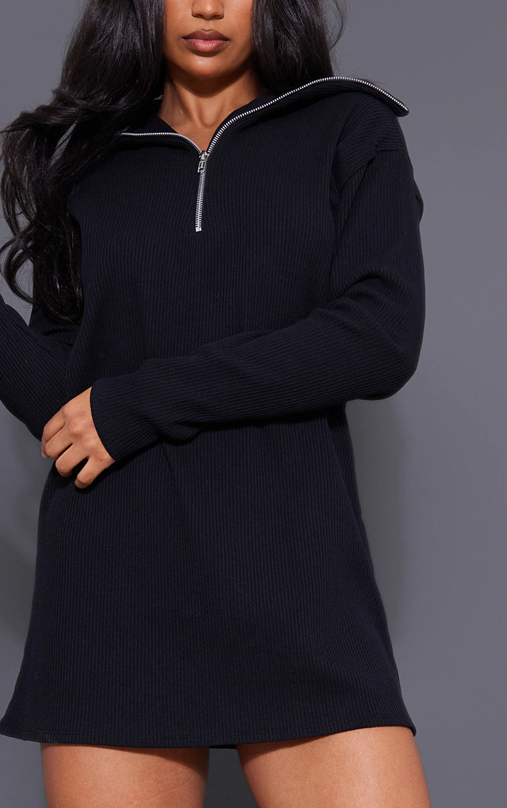 Black Rib High Neck Half Zip Oversized Sweater Dress