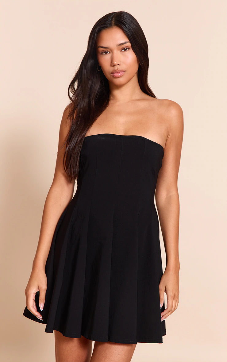 Black Stretch Woven Bandeau Pleated Shift Dress