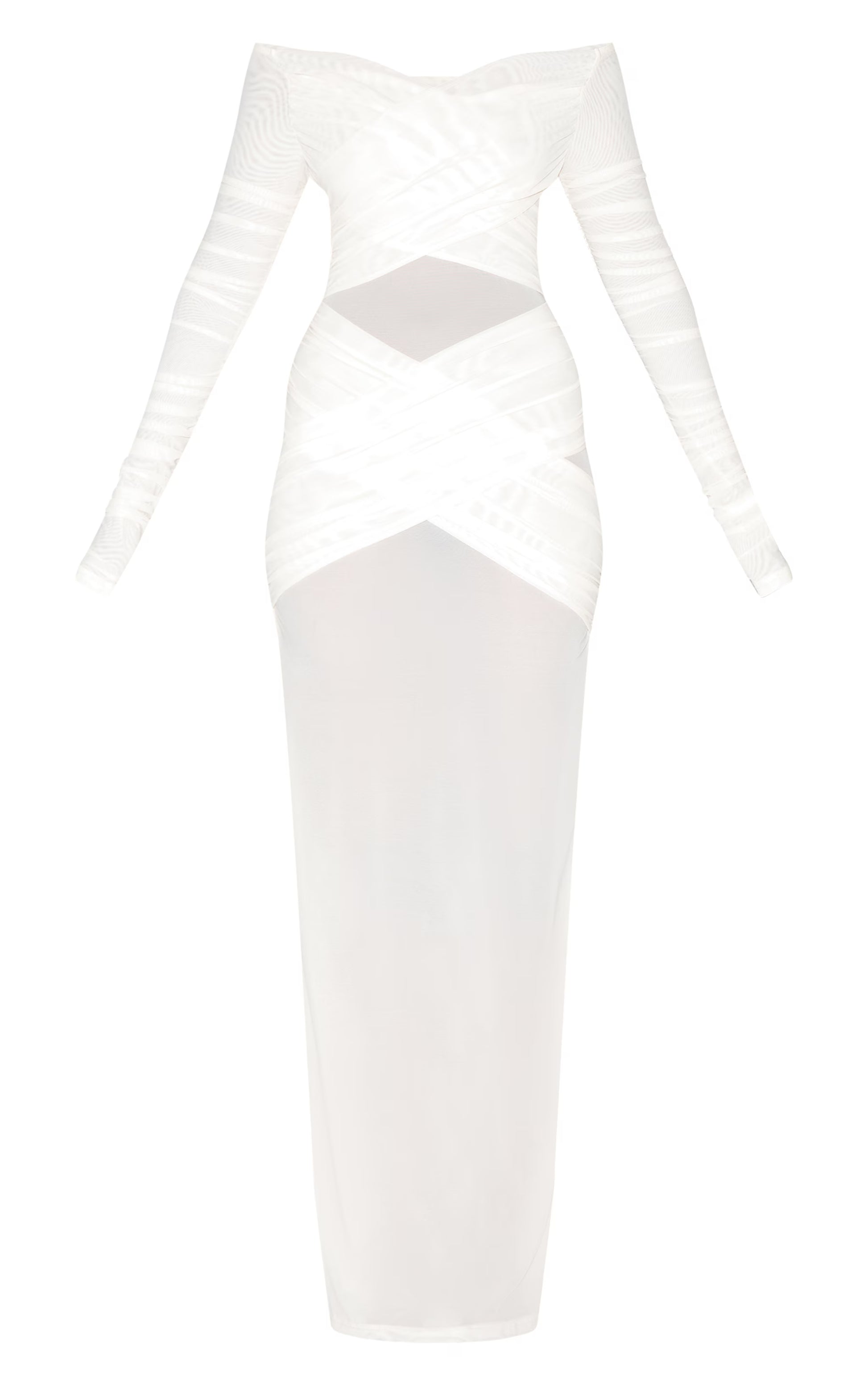 Cream Bandage Mesh Bardot Layered Ruched Maxi Dress