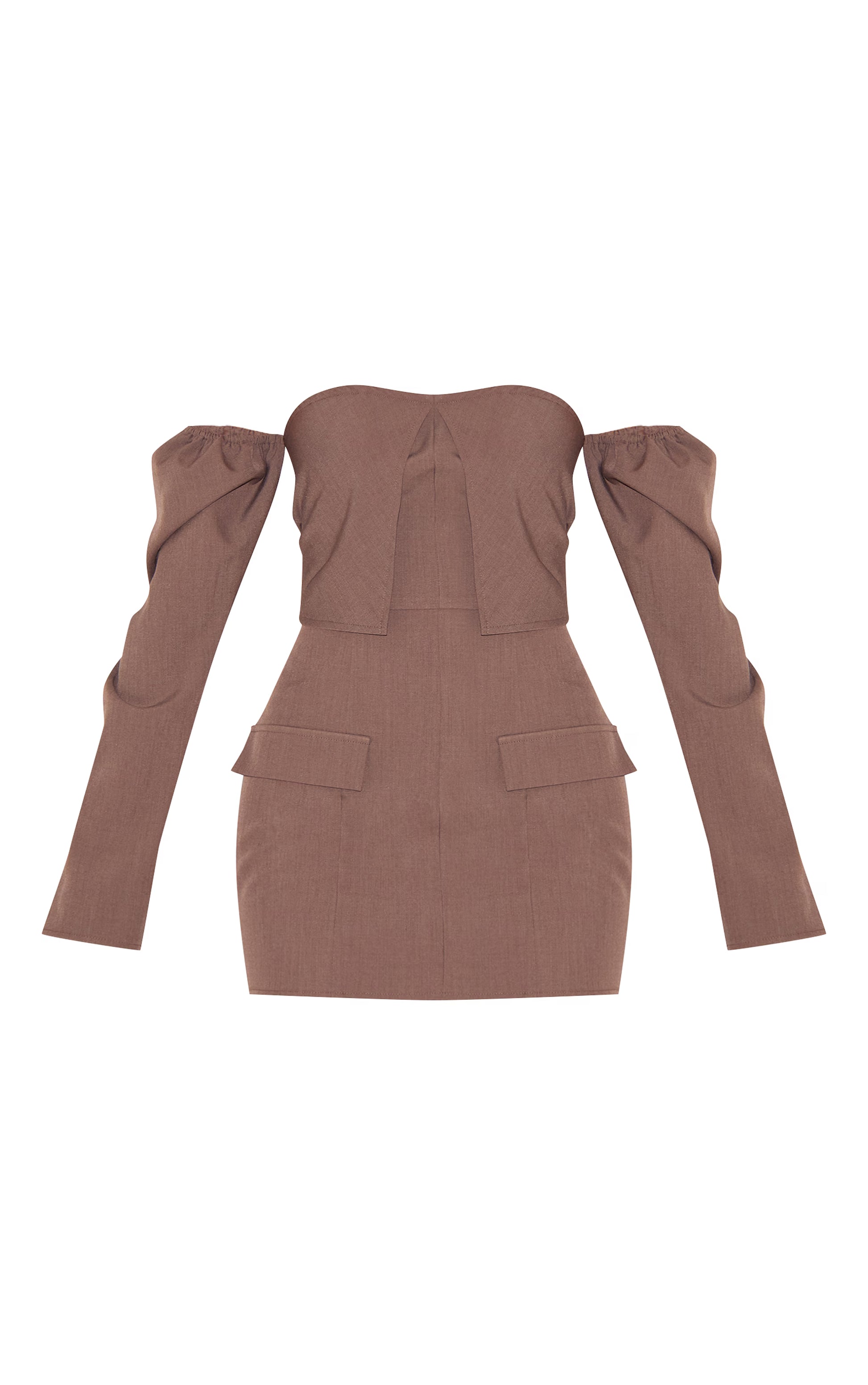 Mushroom Woven Tailored Long Sleeve Bardot Pocket Detail Mini Dress