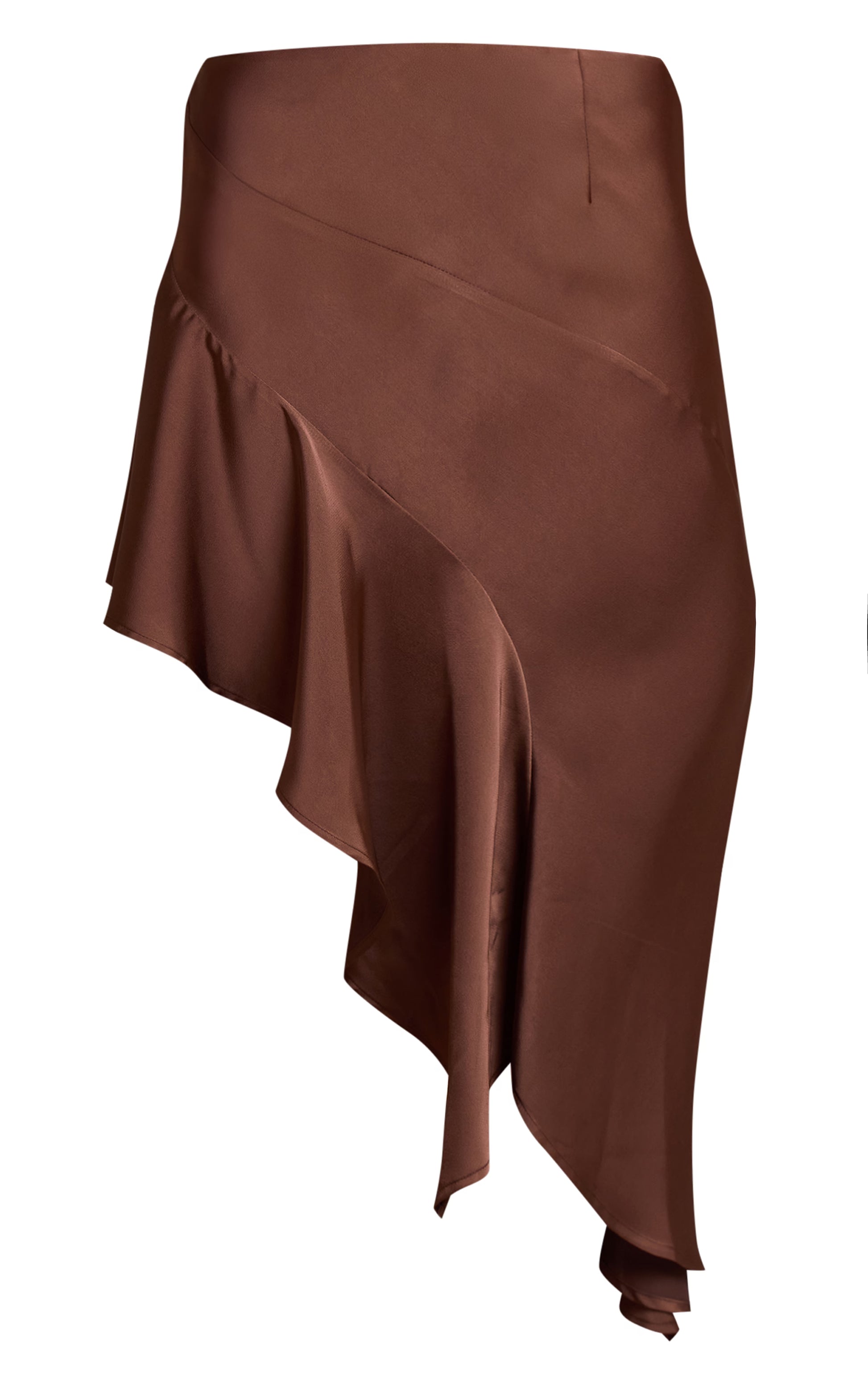 Update your wardrobe with the chocolate satin asymmetric ruffle midi skirt. Crafted from a soft satin fabric, the silhouette is flattering and flowy. Pair with the matching ruffle top, heeled sandals and a bag for a dressed up daytime vibe.