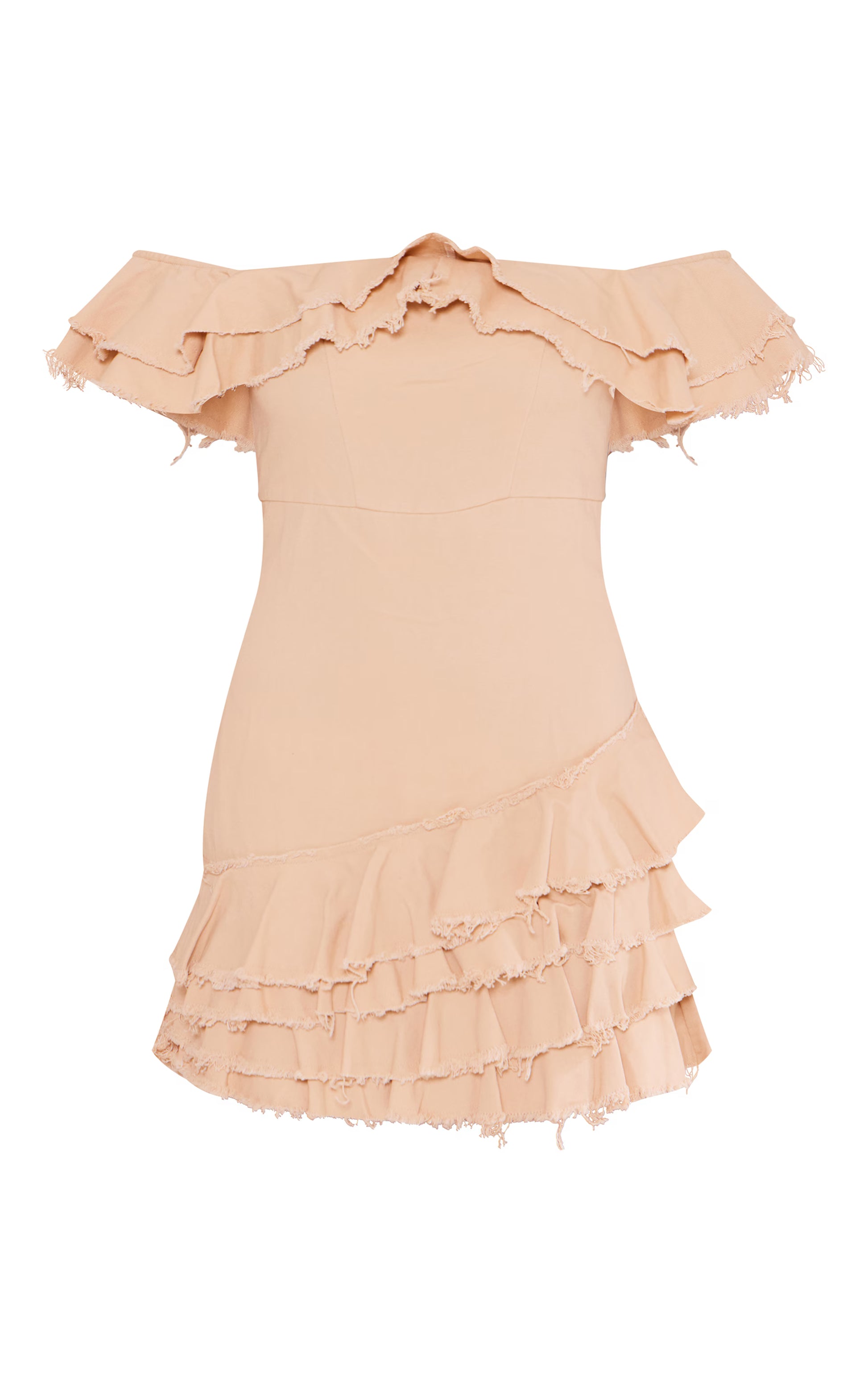 Cream Twill Bardot Frayed Edge Tiered Shift Dress
