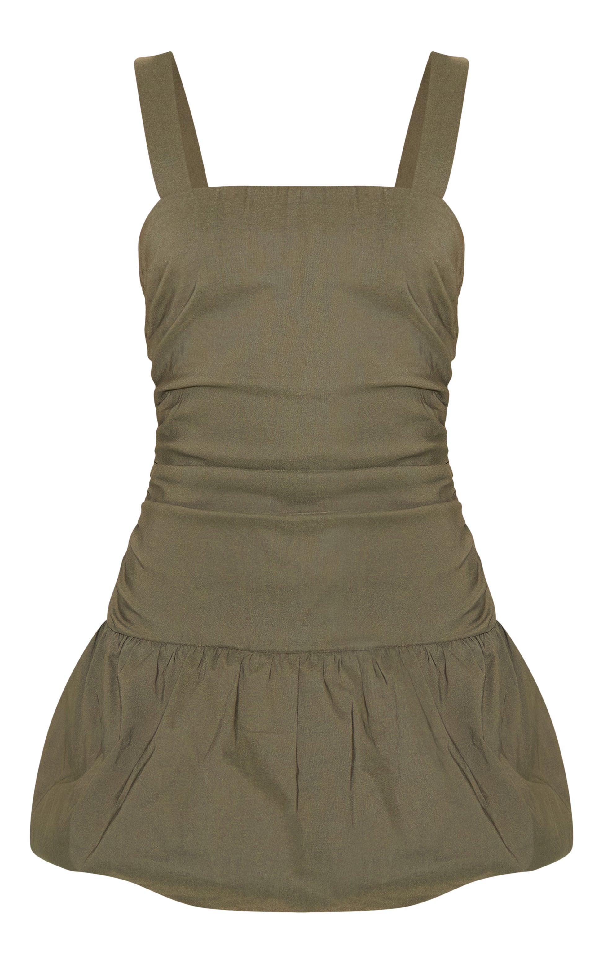 Keep it cute in this khaki strappy ruched puffball dress. Brought to you in a deep green hue, this dress has thick shoulder straps with a unique puffball skirt. For the perfect finish, add flat strappy sandals, gold bangles and miniature gold hoop earrings.