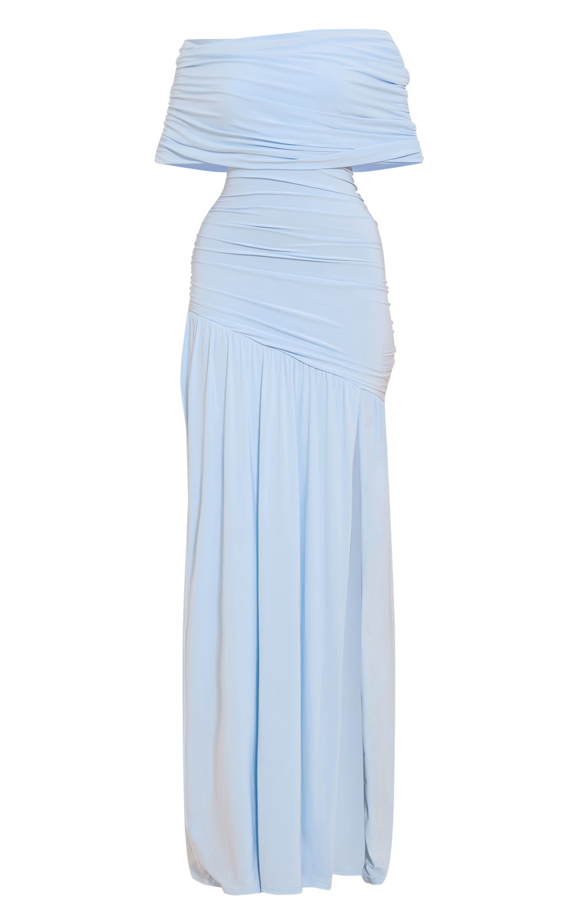 Own the room the moment you enter it. This blue double layer slinky bardot one shoulder ruched maxi dress is designed for impact, featuring a knowing off-the-shoulder bardot neckline transitioning to a modern one-shoulder cut. Ruched detailing cinches the form before falling to a sweeping maxi length with a sharp high split. Style with simple strap heels and a clean-lined clutch for a look that means business.