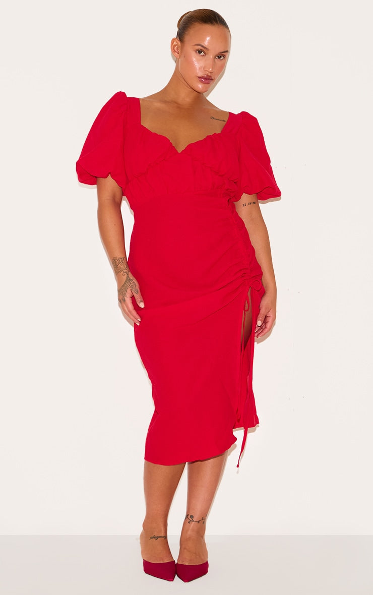 Plus Red Puff Sleeve Ruched Split Side Midi Dress