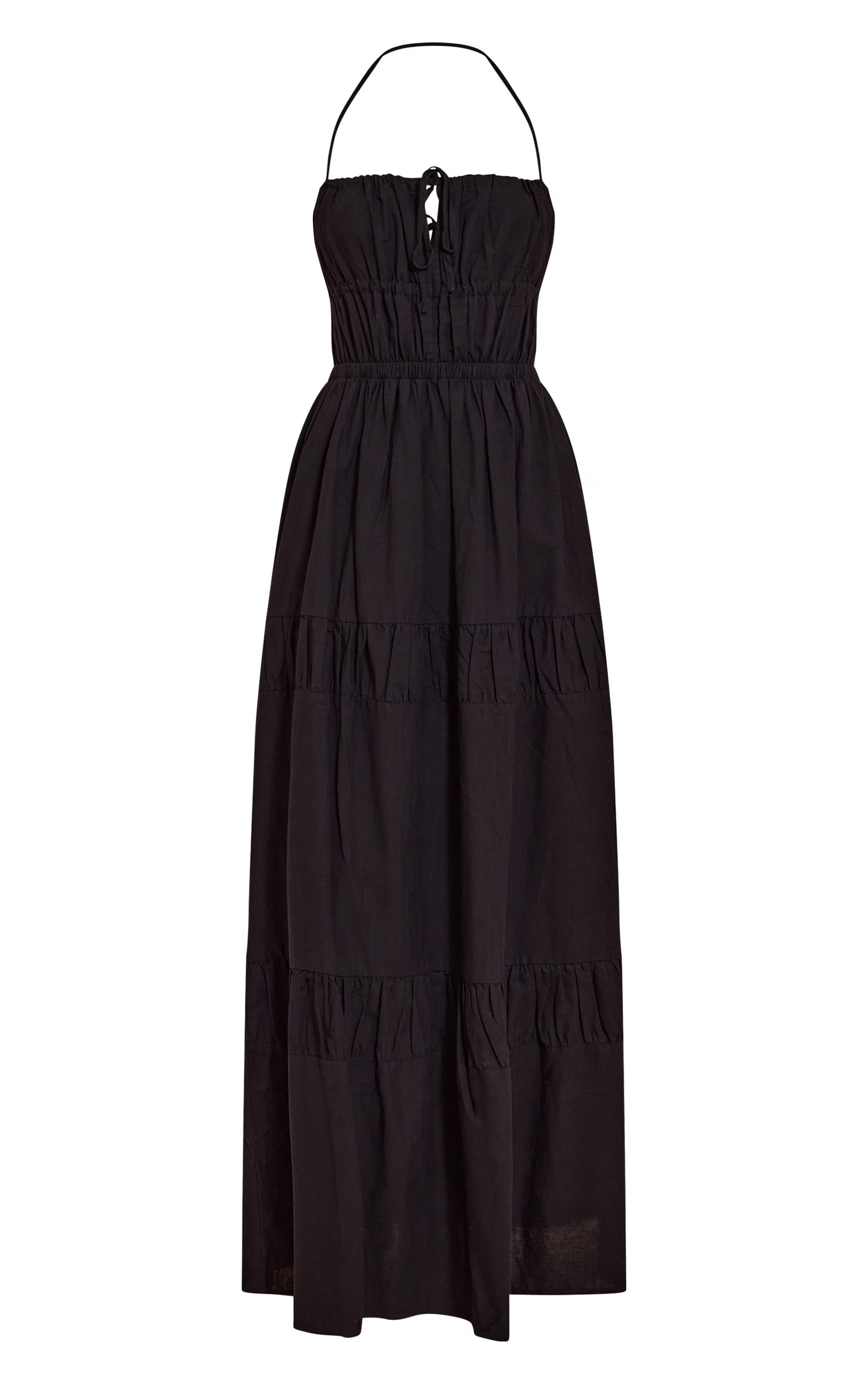 Exude effortless elegance in this black ruched backless strappy maxi dress. Tailored from black material, this dress has a backless design with strappy detailing, thin spaghetti halter neck straps and a tiered skirt. Keep it sleek by pairing this piece with understated sandals, a gold bangle and your favorite earrings.