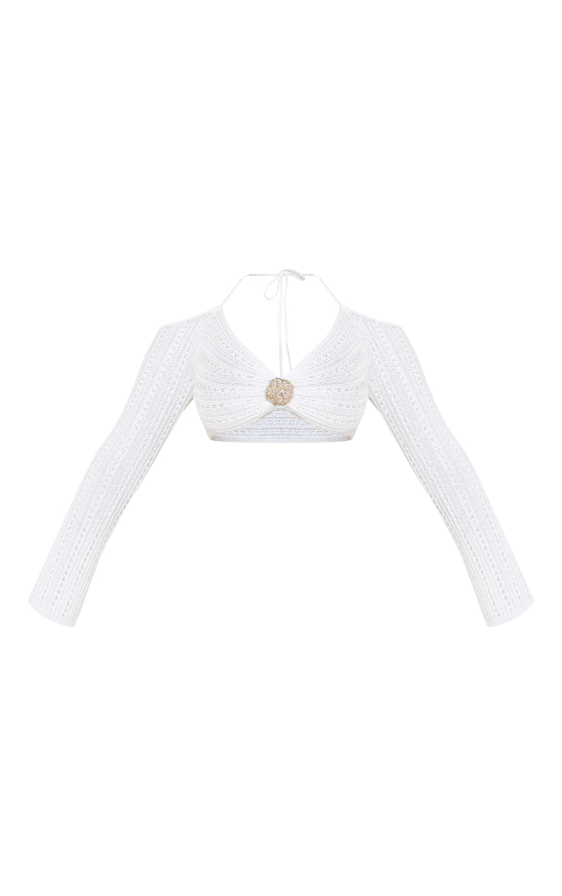 Shape White Crochet Gold Hammered Trim Halterneck Crop Top