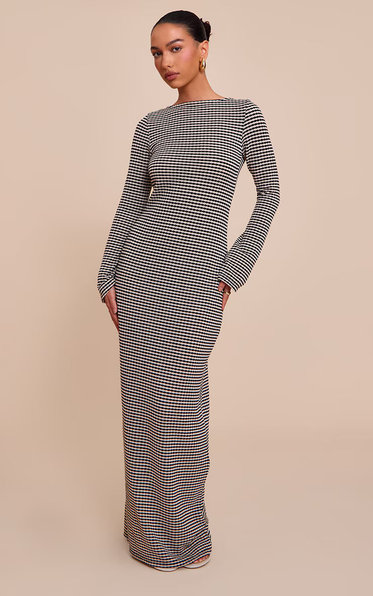 Black Monochrome Textured Scoop Back Long Sleeve Maxi Dress