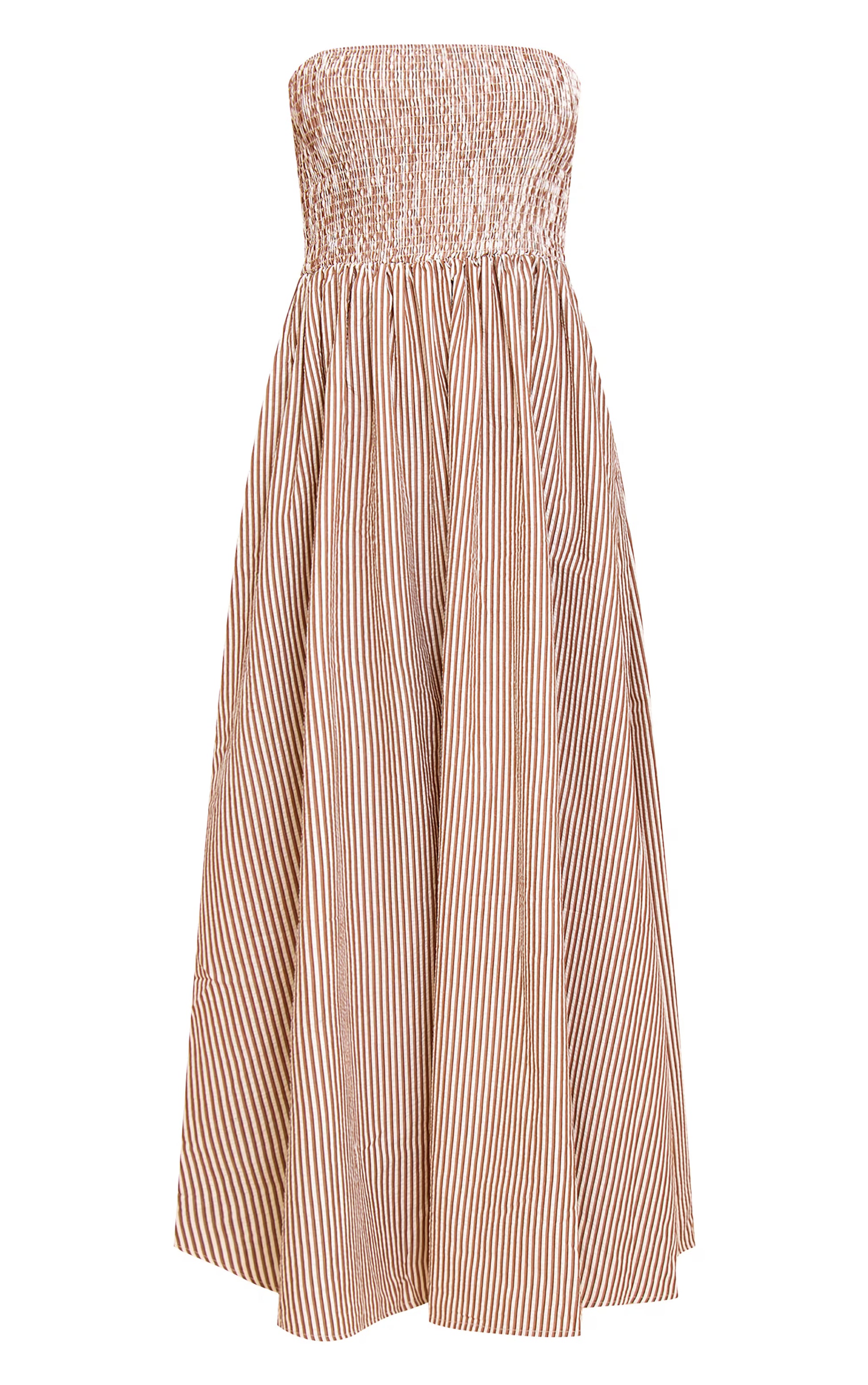Turn heads in this chestnut striped bandeau maxi dress. Made from a chestnut material with a stripe design a bandeau fit and a statement maxi length. Team this dress with a pair of sandals and earrings for a look that can be taken from say to night insntantly.