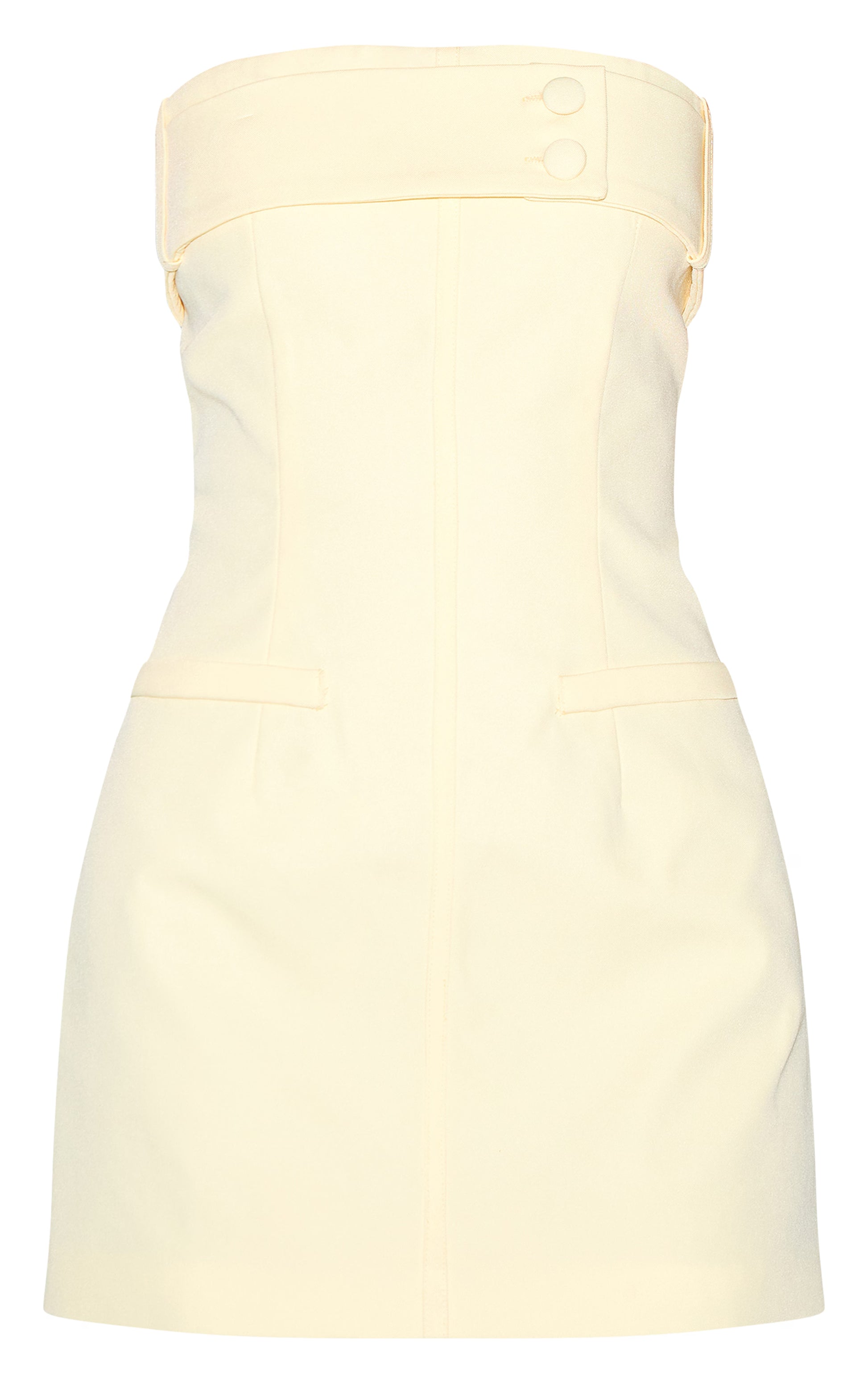 Step out with purpose. This lemon woven belt detail shift dress presents a refined strapless cut that defines the neckline with precision. A distinctive woven band contours the waist, detailed with two striking round buttons, before the confident shift silhouette flows to a mini length, complete with useful front pockets. Crafted from a woven fabric that maintains its shape, this piece is built for effortless evening moments. Anchor the look with sharp minimal heels and a compact wristlet.
