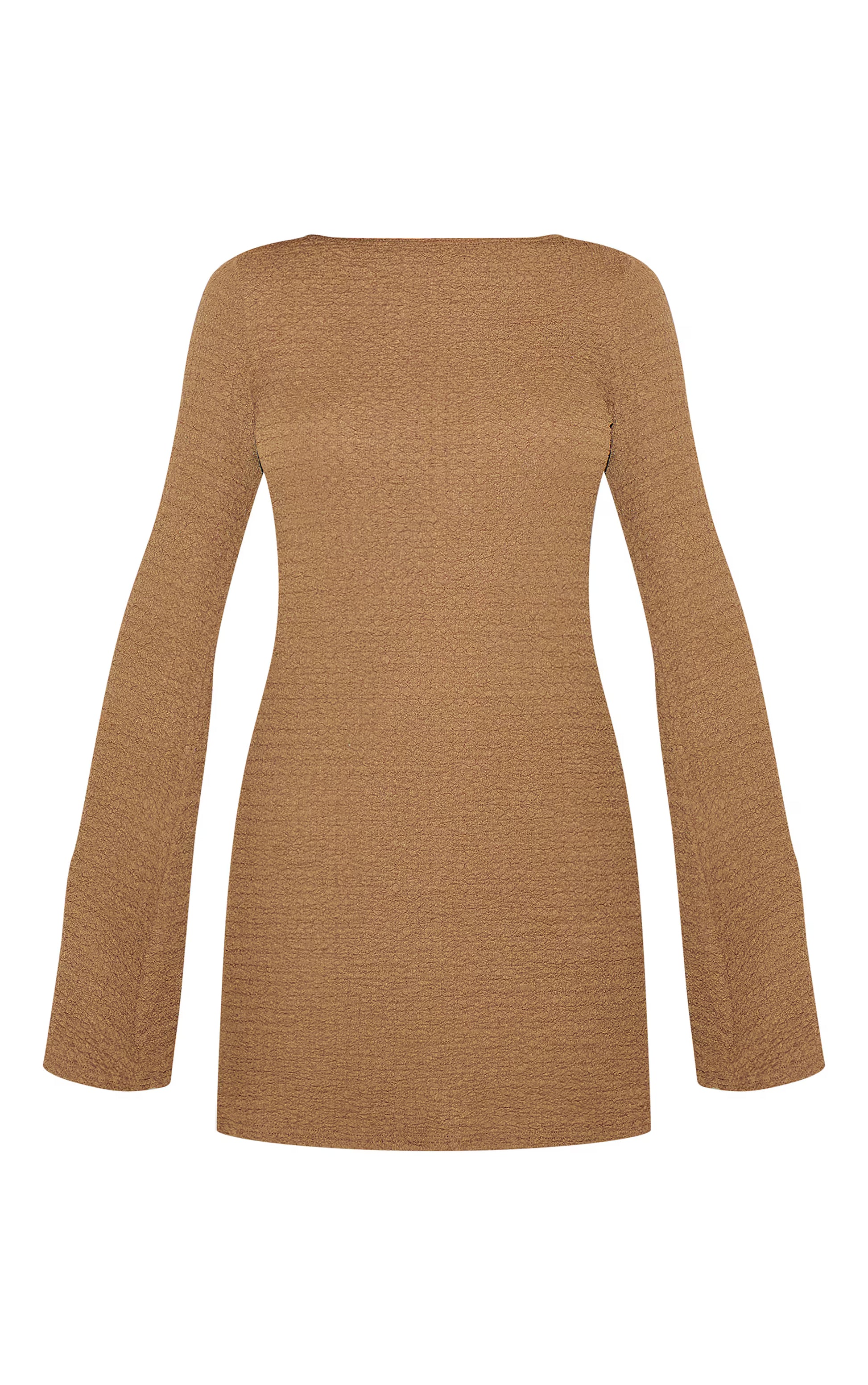 Opt for a classic look in this taupe textured boat neck long sleeve shift dress. Tailored from a taupe hue material, this dress has flared long sleeves with a chic boat neckline. Simply style it with statement chunky heels and refined jewelry for a boho-chic look.