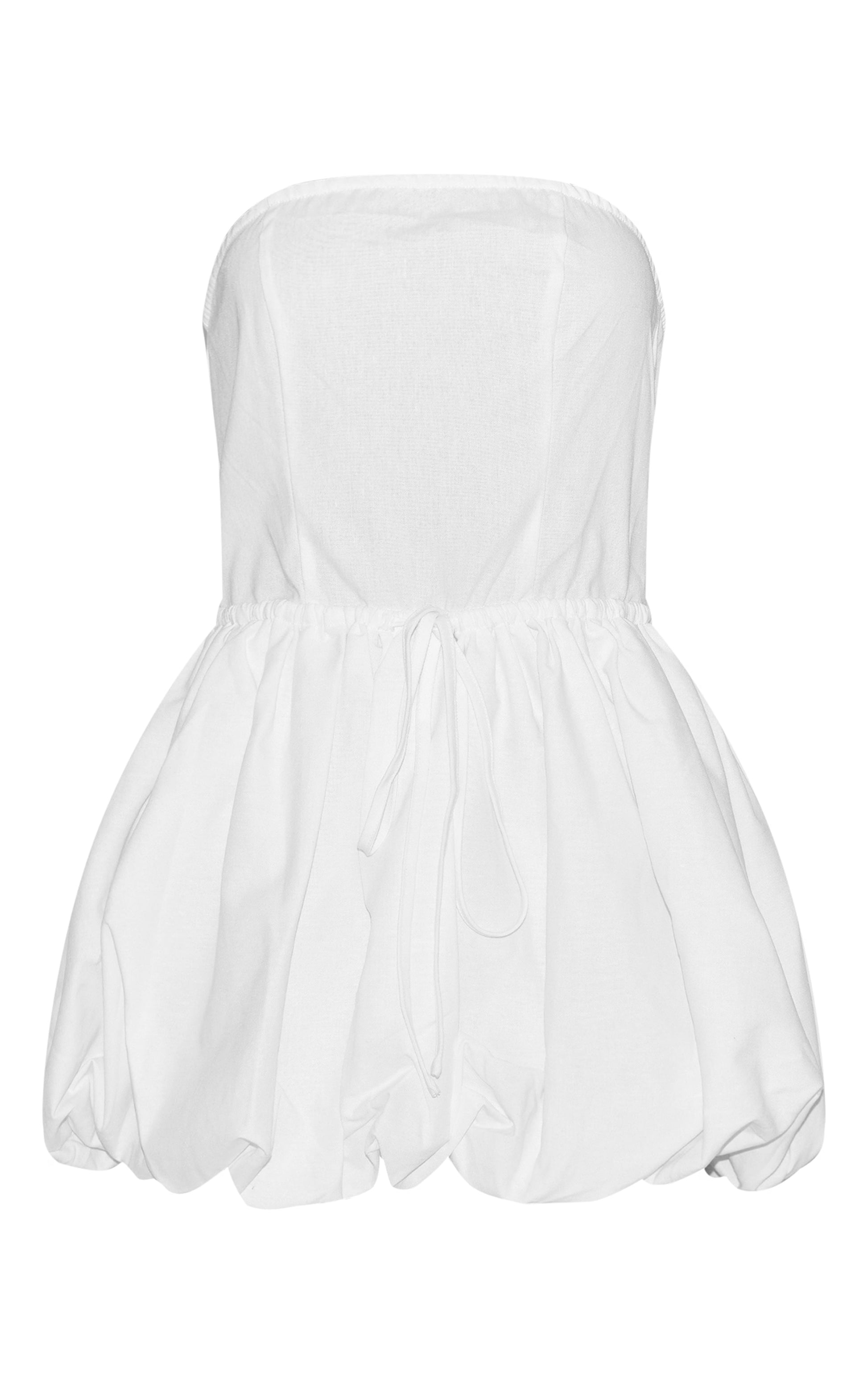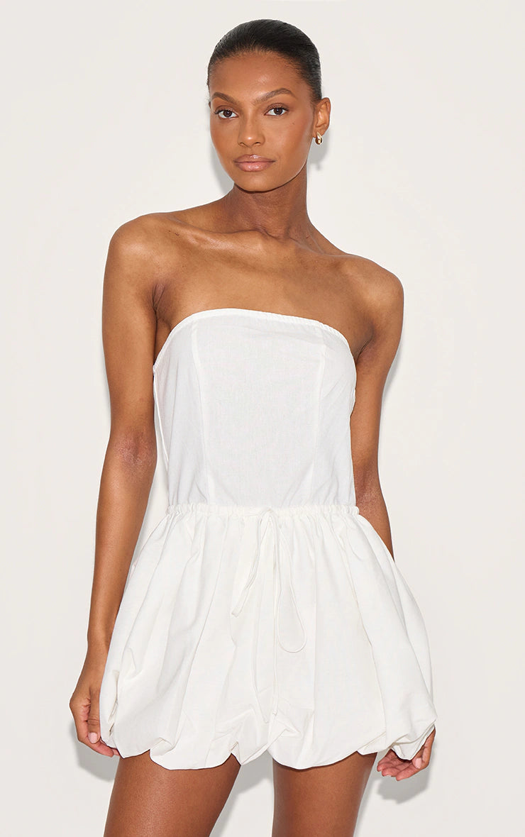 White Linen Bandeau Tie Waist Puffball Dress