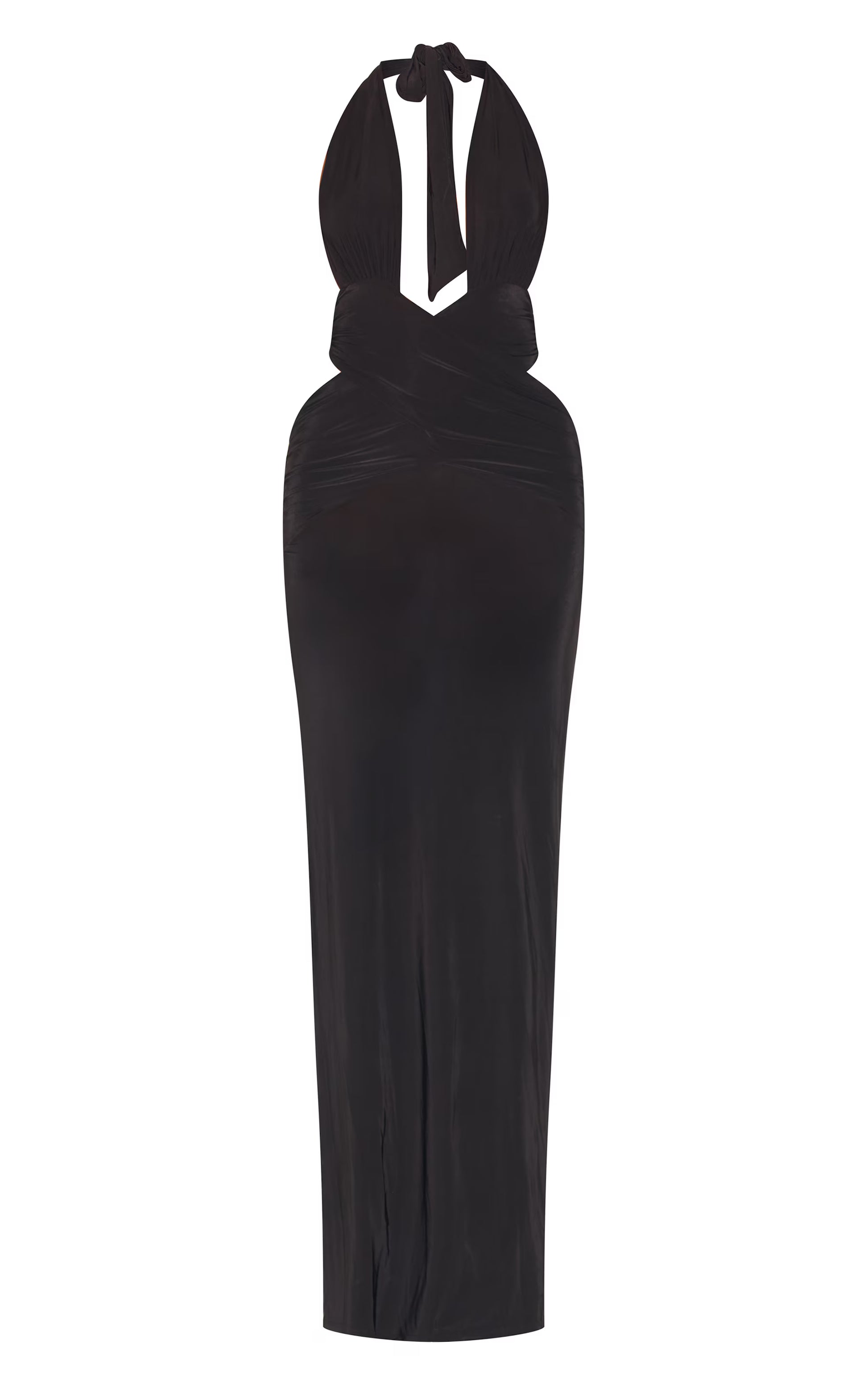 The black maxi dress, rendered in a slinky knit, is the after-dark essential your wardrobe is currently lacking. Its defining characteristic is the extreme plunge neckline, a detail that commands attention with understated confidence. The fabric drapes beautifully, skimming the figure to create a streamlined silhouette. Consider styling it with a delicate chain necklace from our jewelry collection to further accentuate the neckline and complete the look.