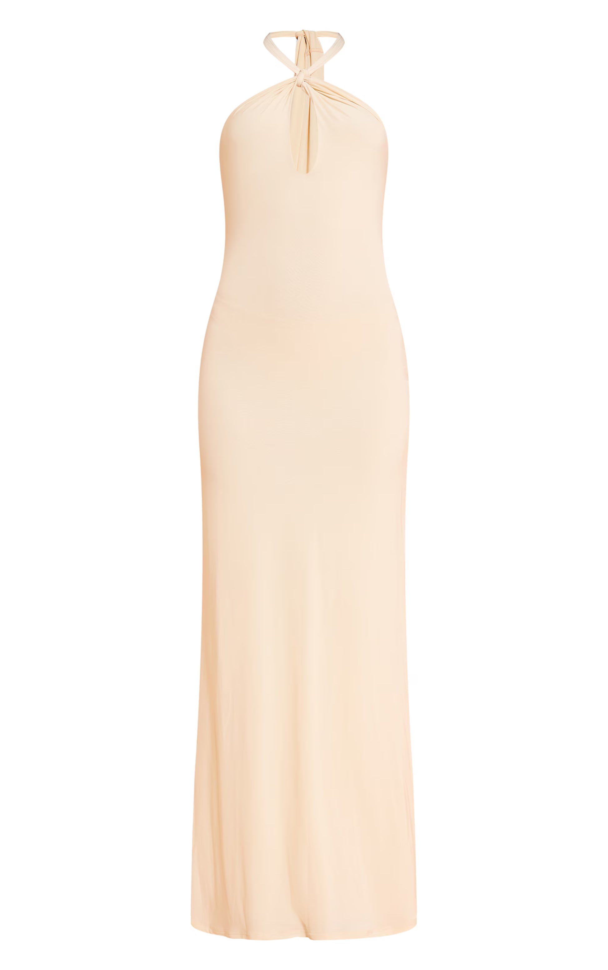 Sleek form meets artful detailing, setting the tone for your next occasion. The almond slinky keyhole detail sleeveless maxi dress, in its subtle almond hue, effortlessly shapes a long, flattering profile. Its standout feature, a distinctive twisted halter neckline, creates an alluring focal point, leading to a chic keyhole cut-out. This bodycon maxi is the definitive piece for an impactful presence. Style it with understated gold-tone heels and a minimalist shoulder bag to complete a look that speaks confidence.