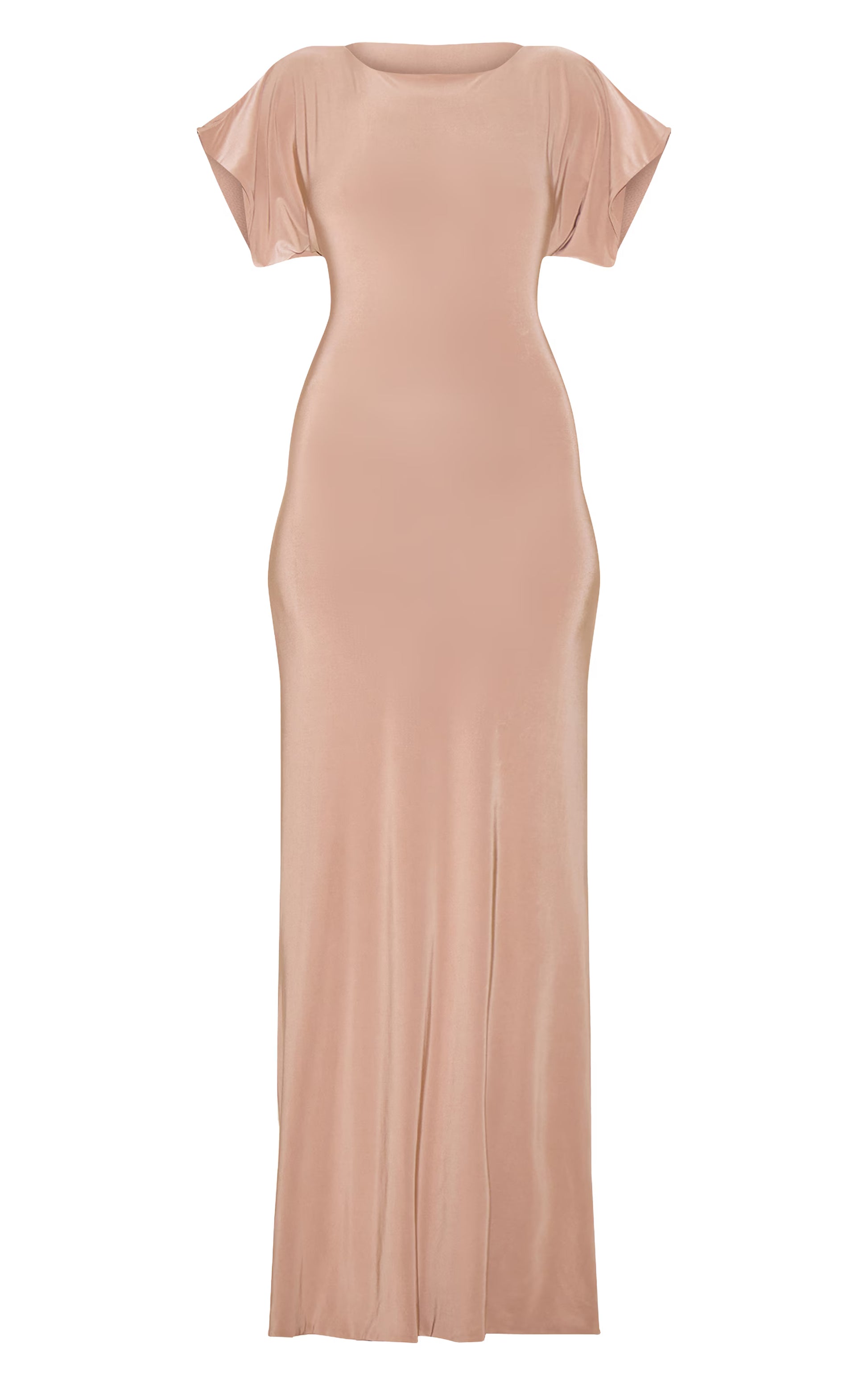 Beige Double Layered Slinky Ruched Short Sleeve Maxi Dress