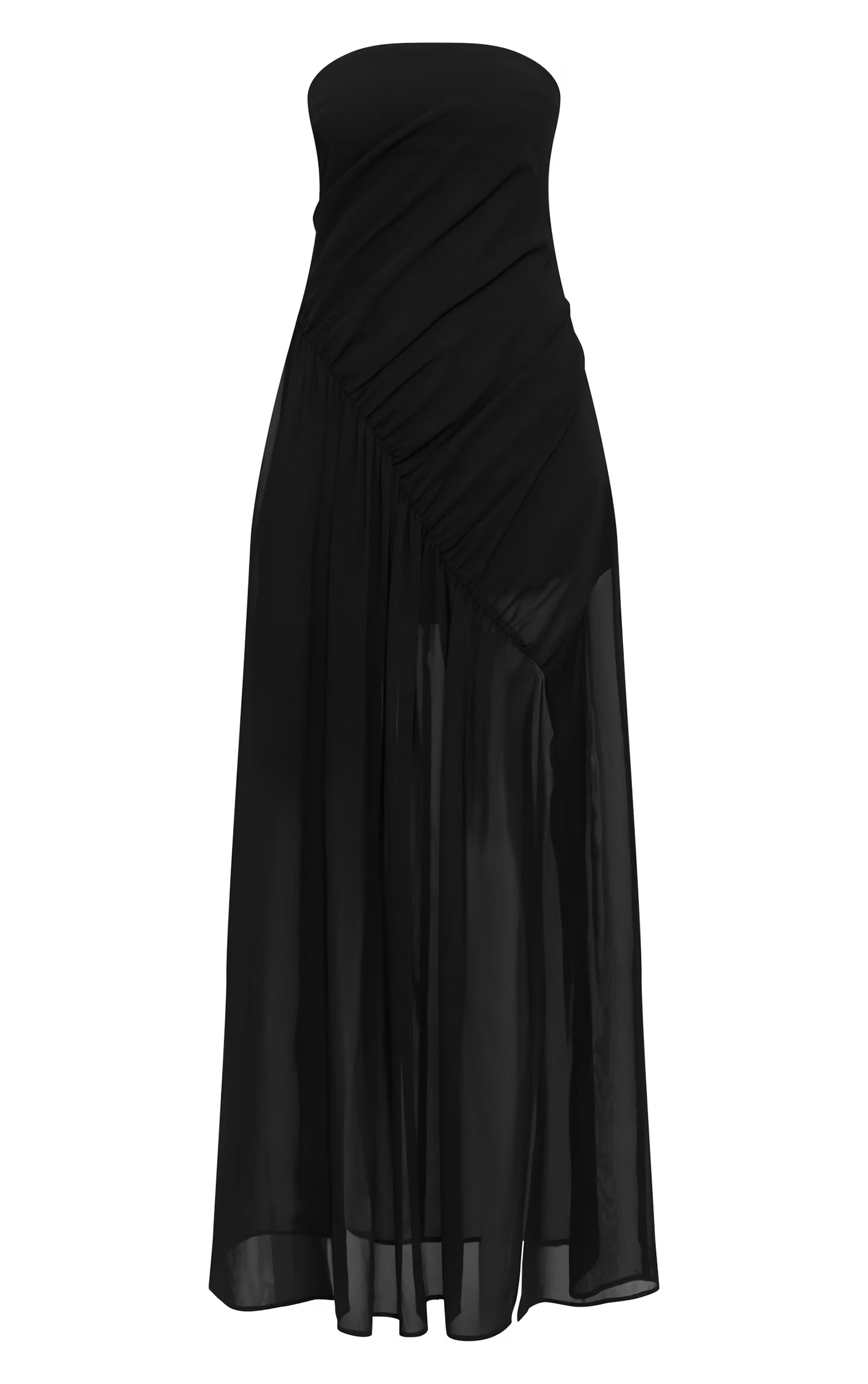 Modern lines meet artful detail for evening impact. This black double layer mesh bandeau asymmetric ruching maxi dress delivers on elevated style with its clean bandeau neckline creating a confident shape. The striking asymmetric ruching adds dimension down one side before the double layer design finishes in a flowing maxi length, creating a subtle sheer effect towards the hem. Anchor this piece for your next event with sharp strappy heels and minimal accessories to complete the look.