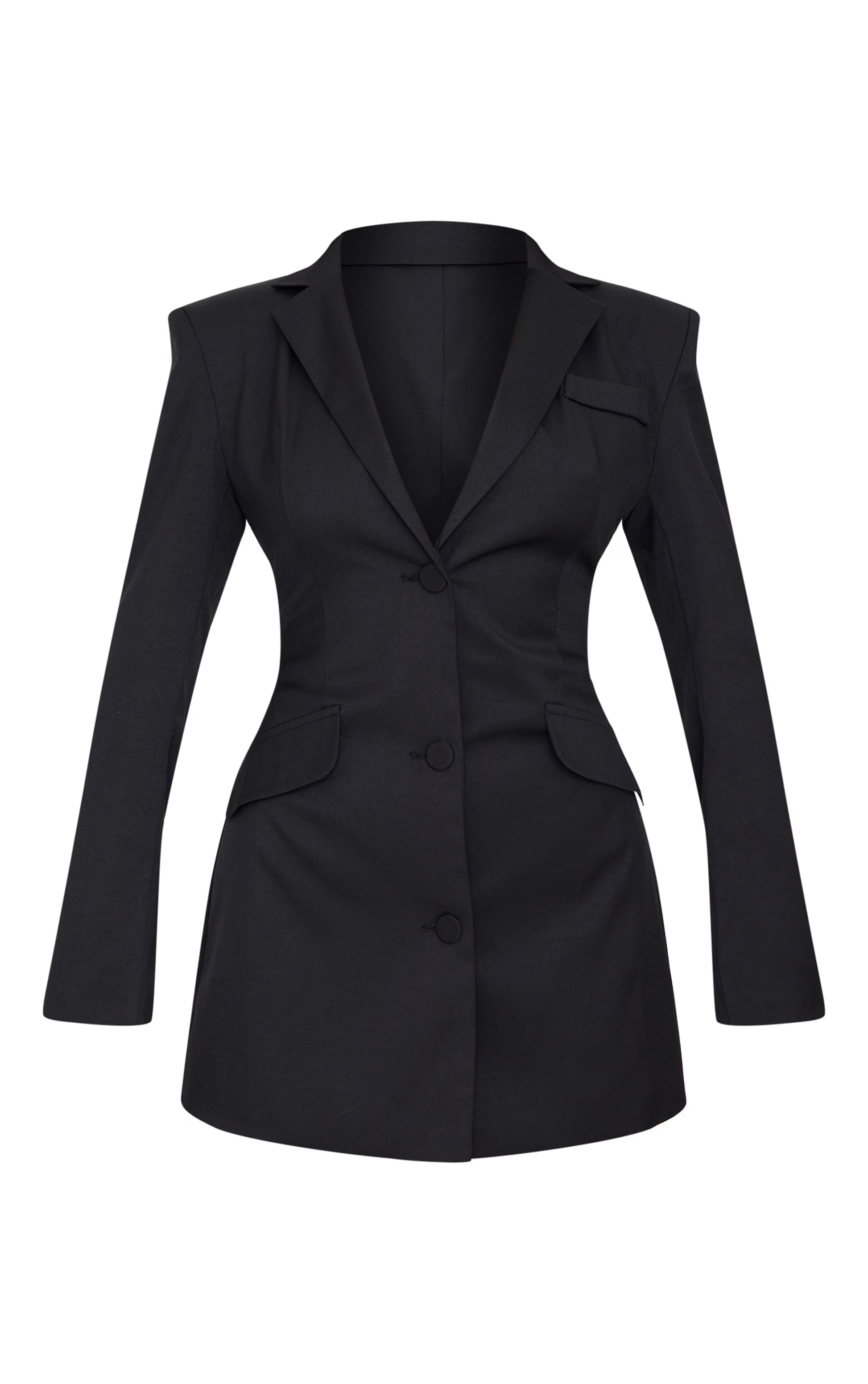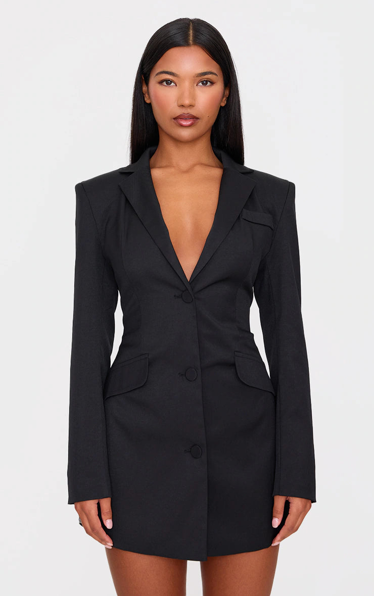 The modern blazer dress, reinterpreted. Crafted in a black woven fabric, this piece offers a considered take on sharp tailoring. The cinched waist sculpts a flattering silhouette, defining the figure with subtle precision. Style it with a delicate chain necklace from our jewelry collection for an after-dark ensemble that commands attention.