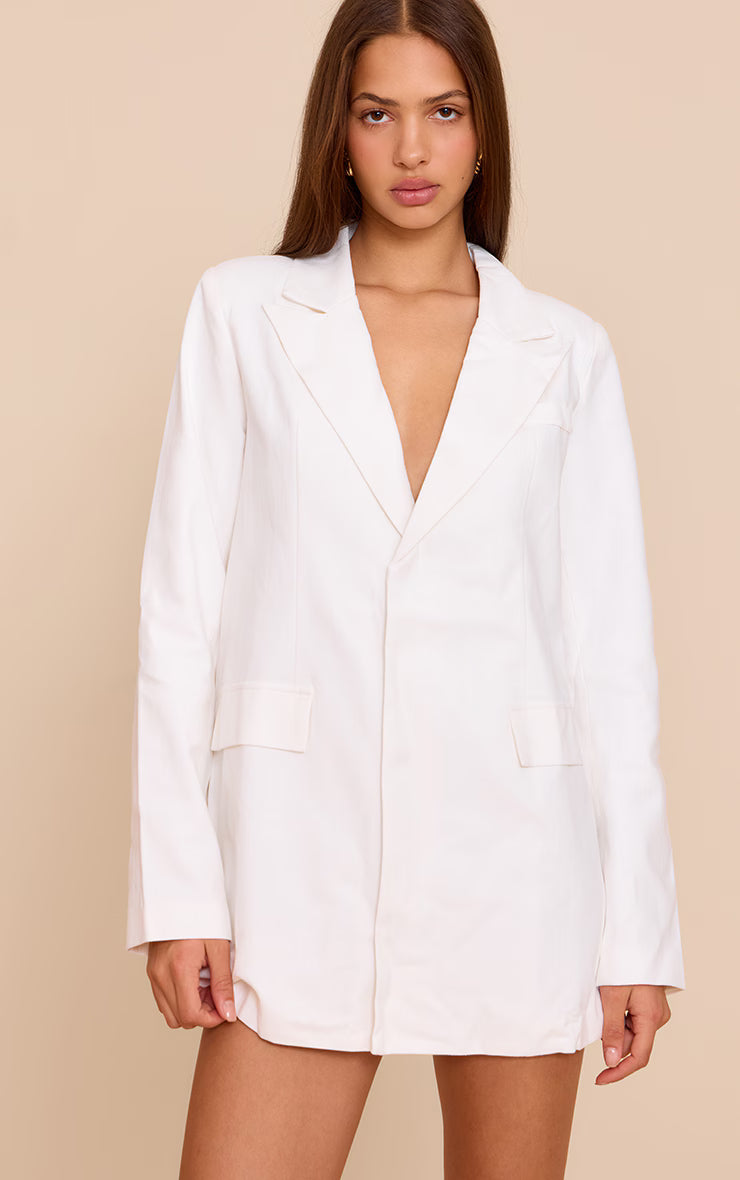 Exude sophistication in this white linen blend blazer dress. Brought to you in structural white linen blend material, this dress has long sleeves, a collared neckline and an elegant mini length fit. Keep your look simple by teaming this piece with a pair of barely-there heels and your go-to earrings.