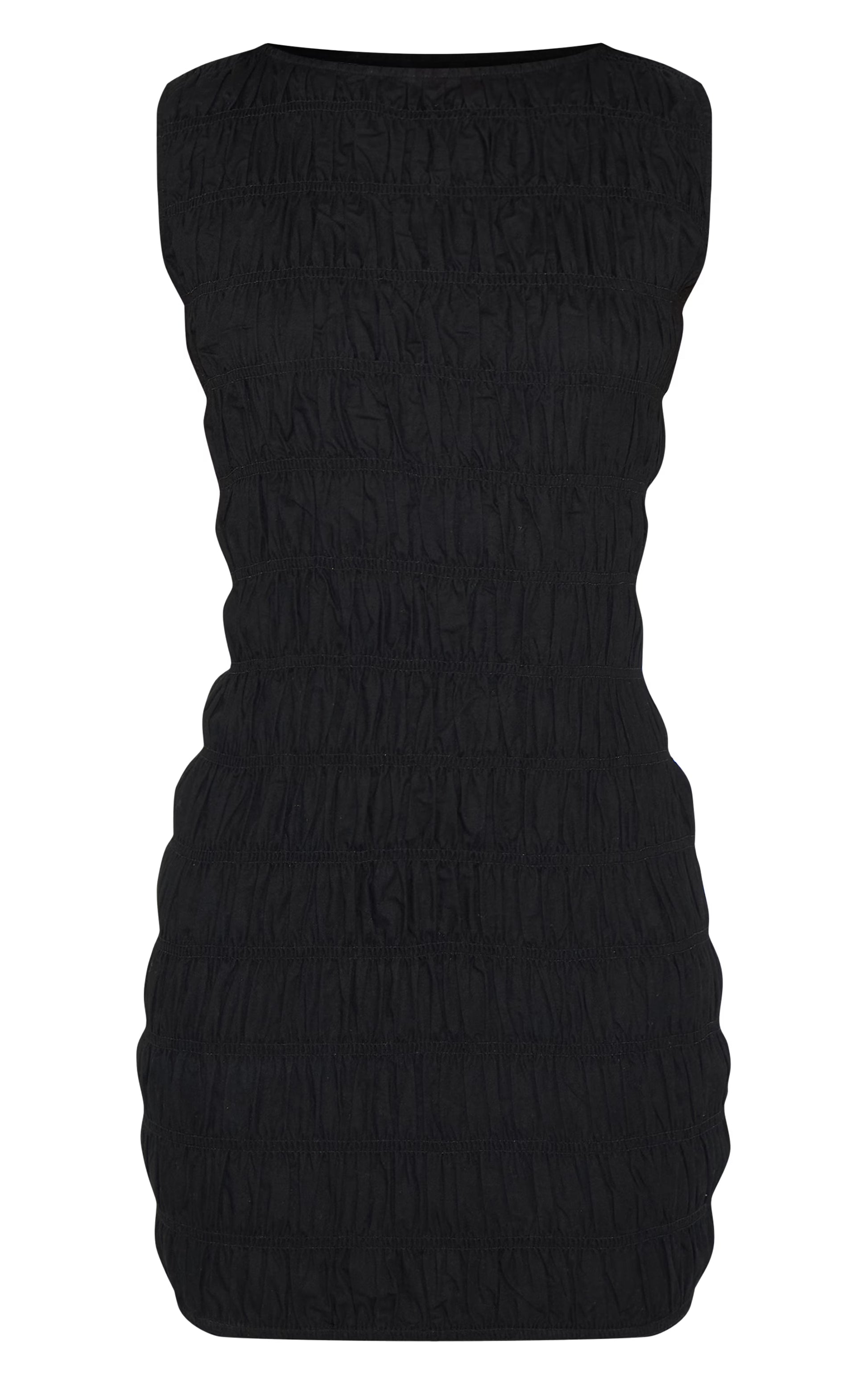 Own the day agenda in essential black. The Black Boat Neck Shirred Bodycon Dress sets a sharp line with its distinctive boat neckline. All-over shirring sculpts the bodycon fit, adding subtle texture and definition throughout this sleeveless style. Complete this versatile piece with fresh sneakers or flat sandals and a simple jacket for a knowing daytime edit ready for anything.