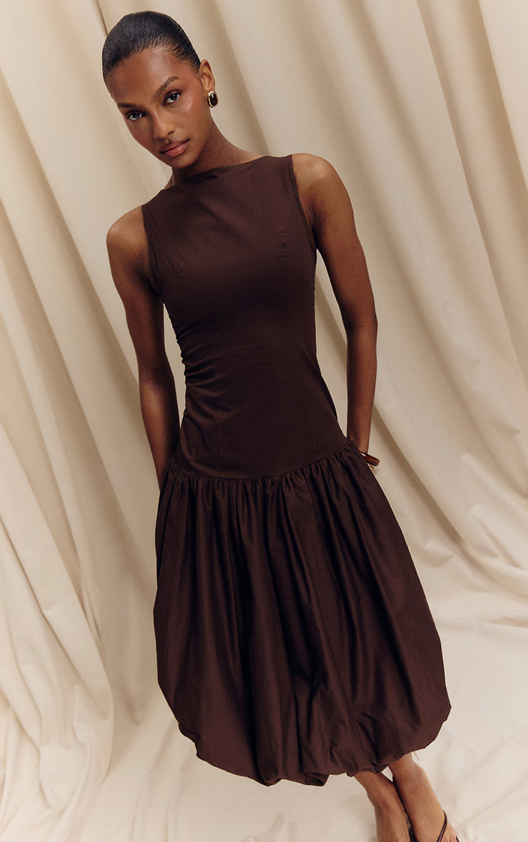 Made from a chocolate brown hue material with a dropped waist design and a flattering midaxi fit. Style this chocolate brown longline dropped waist midaxi dress with matching hue heels and minimal accessories for a look designed for your plans.
