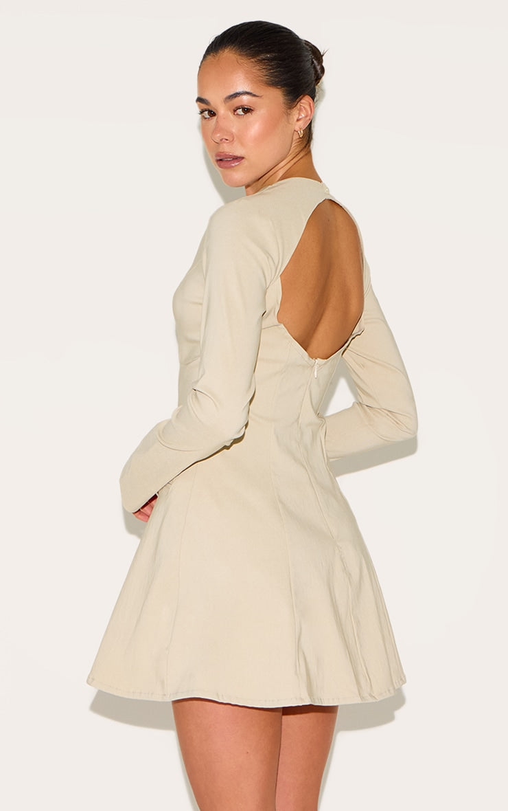 Beige Woven Boat Neck Flare Sleeve Shift Dress