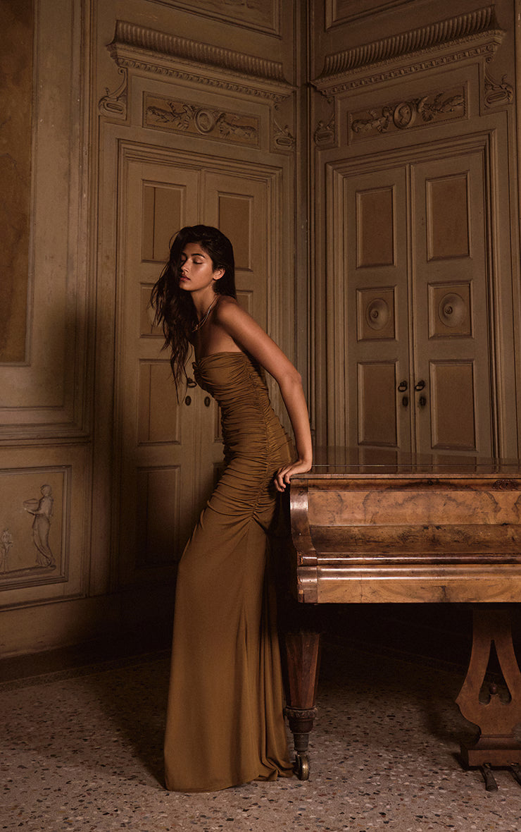 PLT Label Golden Olive Slinky Ruched Bandeau Fishtail Maxi Dress