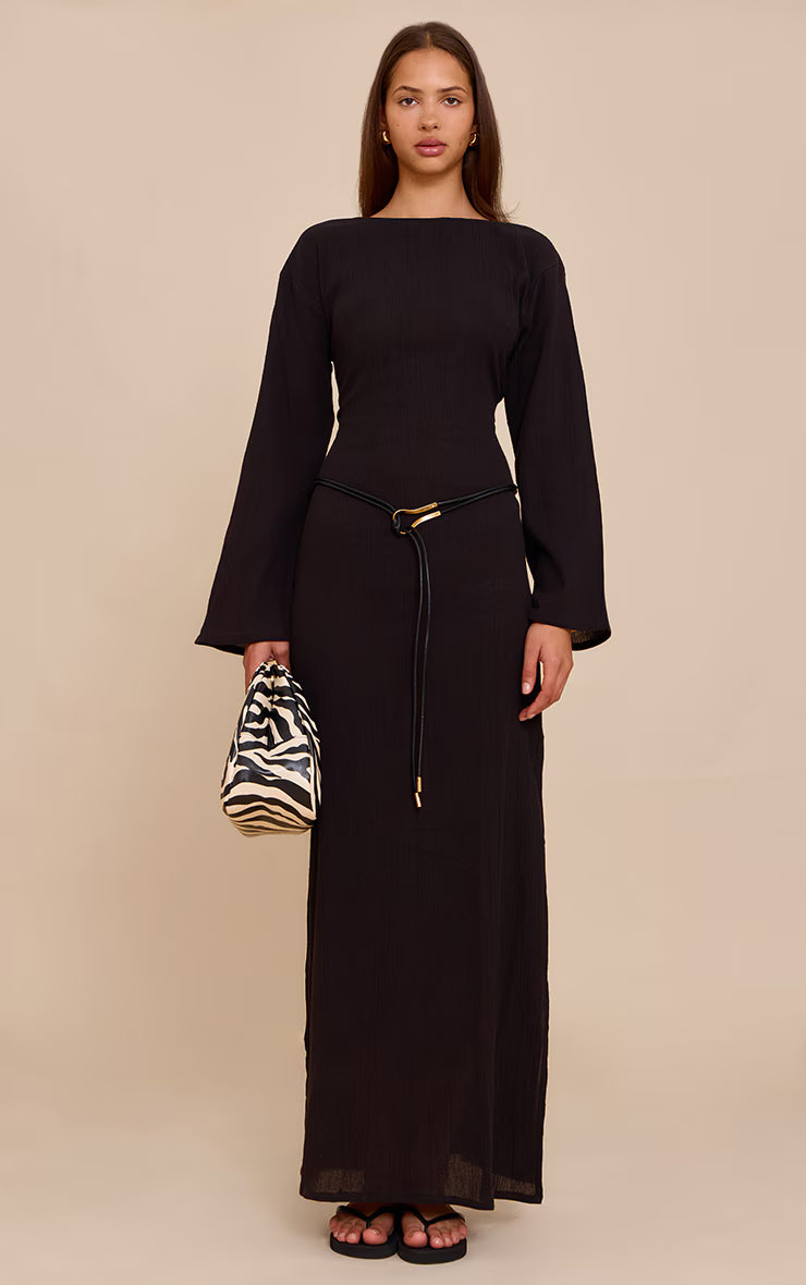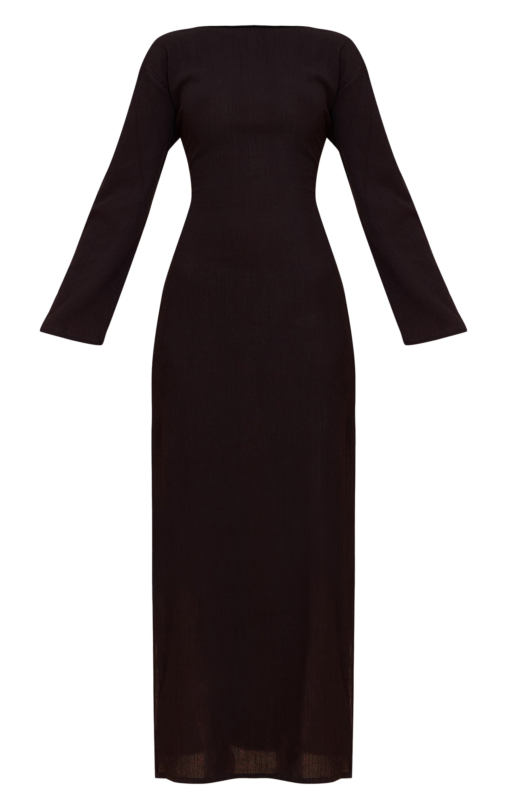 Brought to you in a classic silhouette, this black textured long sleeve maxi dress is the piece your wardrobe needs. Made from textural fabric, this dress has long flared sleeves and a flowing maxi length fit. For elevated glamour, style it with a statement bag, chic sandals and gold jewelry.