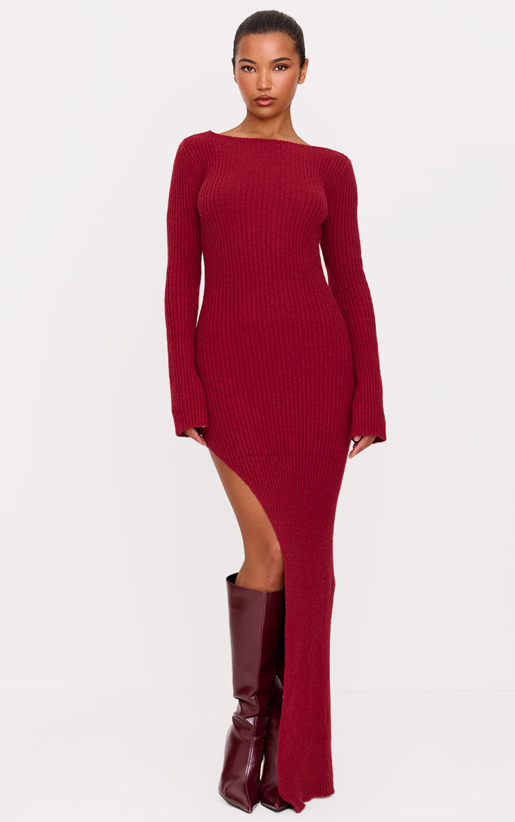 Burgundy Rib Knit Low Back Long Sleeve Maxi Dress