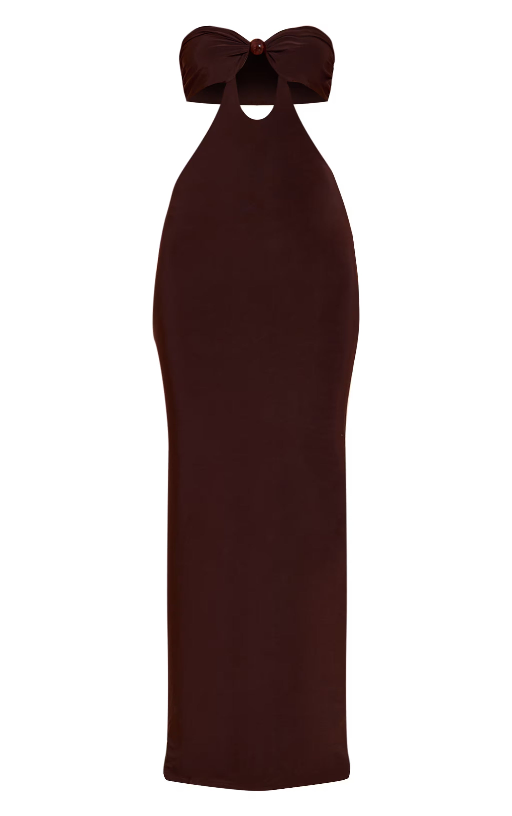 Chocolate Slinky Bead Detail Cut Out Bandeau Maxi Dress