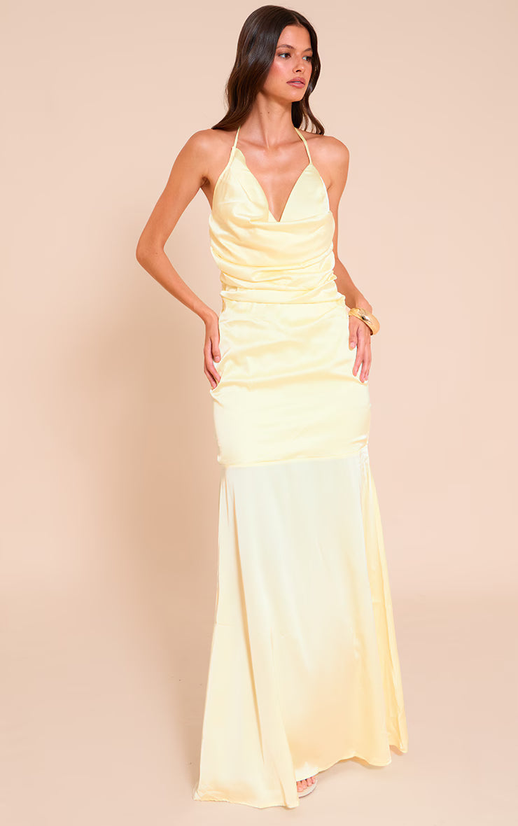Make a statement in this lemon satin asymmetric drape maxi dress. Crafted from pale yellow satin, this dress has a plunging neckline with thin halter neck straps and a flowing maxi length skirt. Pair it with neutral toned heels and chunky gold jewelry for an evening look we're loving right now.