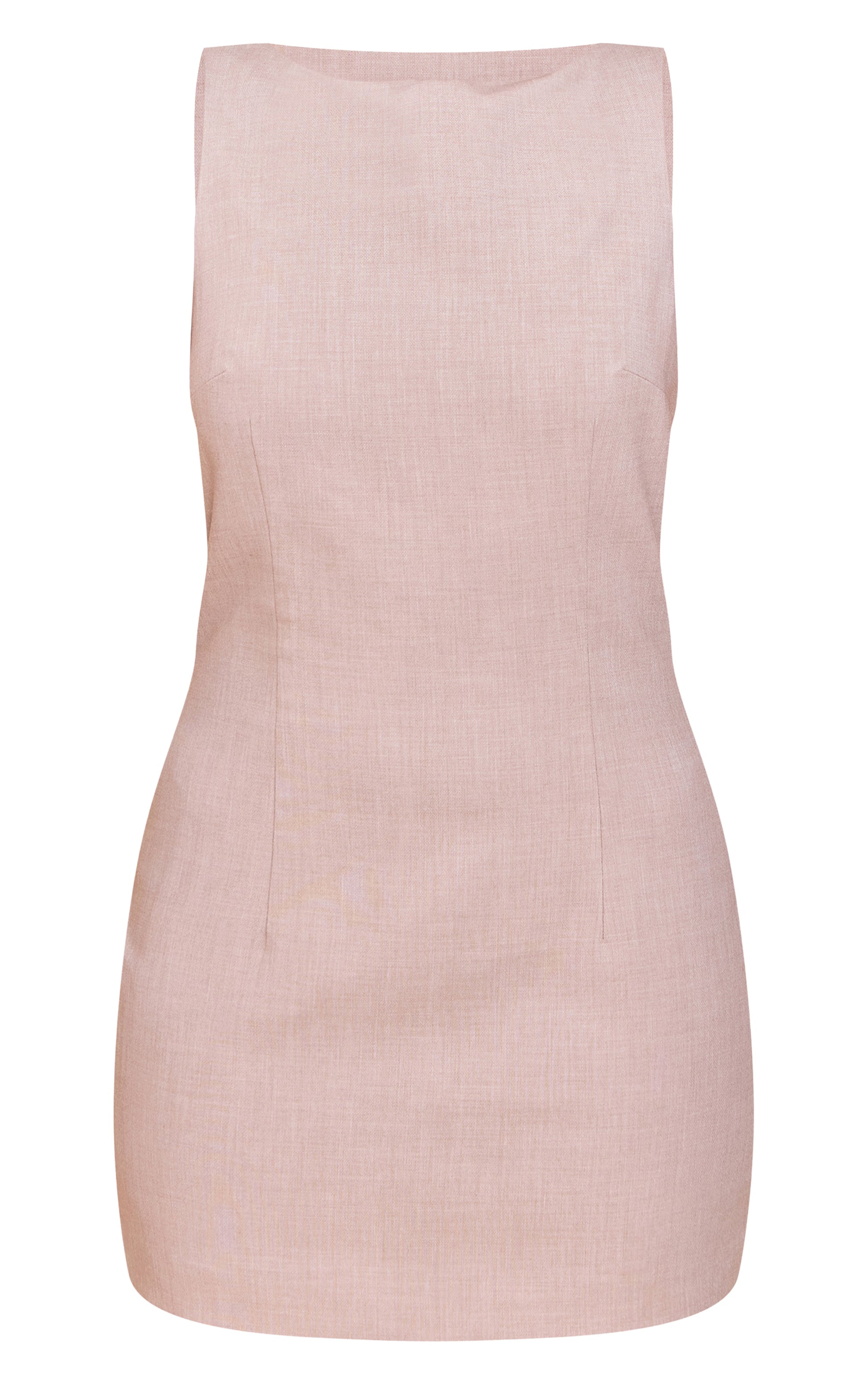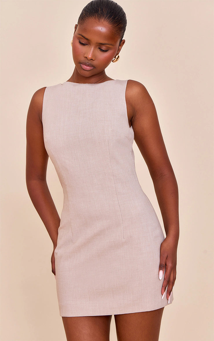 Own your moment with a foundation piece that speaks volumes. The beige woven slash neck mini dress delivers a sharp, streamlined profile. Its sleek, wide slash neckline and sleeveless cut create an incredibly polished aesthetic, defining your form with a confident mini length. This dress is your essential for any evening occasion; simply pair it with sharp heels and a structured clutch for a look that's effortlessly commanding.
