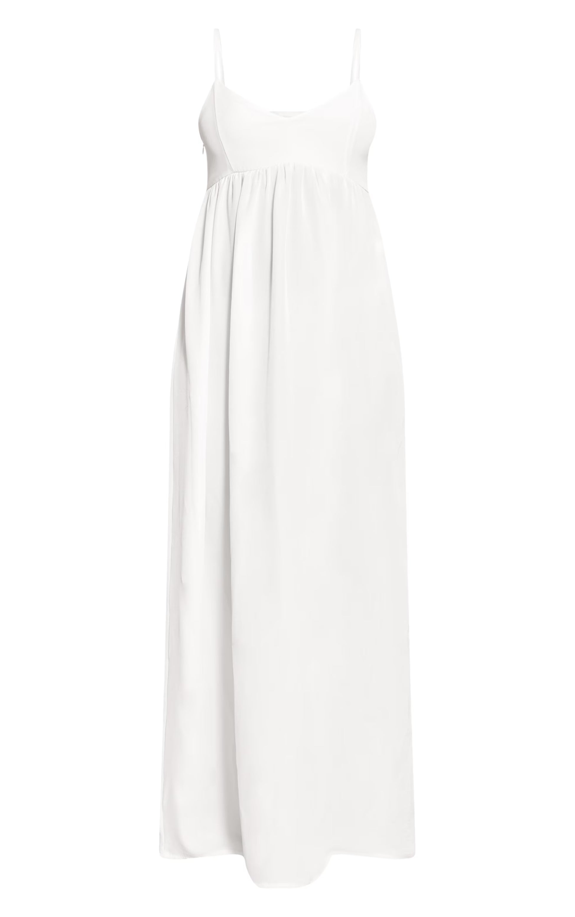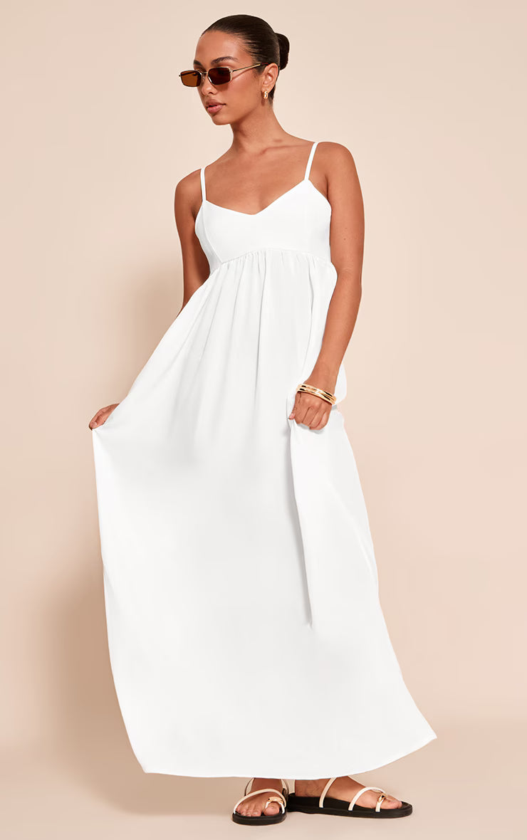 Define your ideal daywear with a piece that understands effortless style. The white textured strappy scoop neck sleeveless maxi dress delivers a clean, uncomplicated silhouette, featuring delicate spaghetti straps and a low scoop neckline that complements its floor-skimming length. Its textured finish adds a subtle dimension to the pristine white hue, ensuring a refined yet relaxed presence. Complete this essential look with understated flat sandals and oversized sunglasses for an assured, sun-drenched aesthetic, perfect for warm days out.