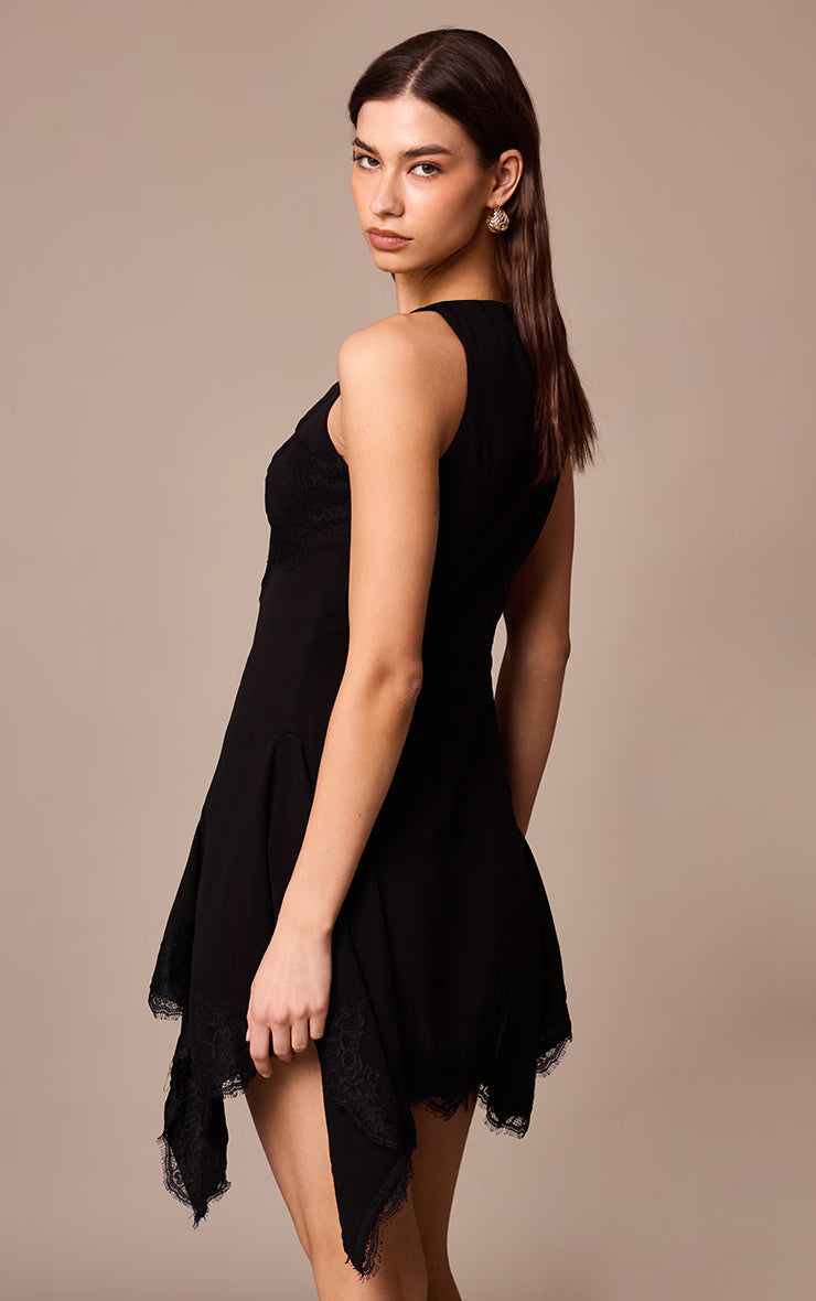 Take your evening look to the next level with this black mini dress. Made from black chiffon, this piece features a plunging neckline, sheer lace overlay and ruffle detailing at the skirt. Perfect for your weekend plans and anything in between, style this piece with simplistic stud fastening earrings, strappy kitten heels and a chic shoulder bag.