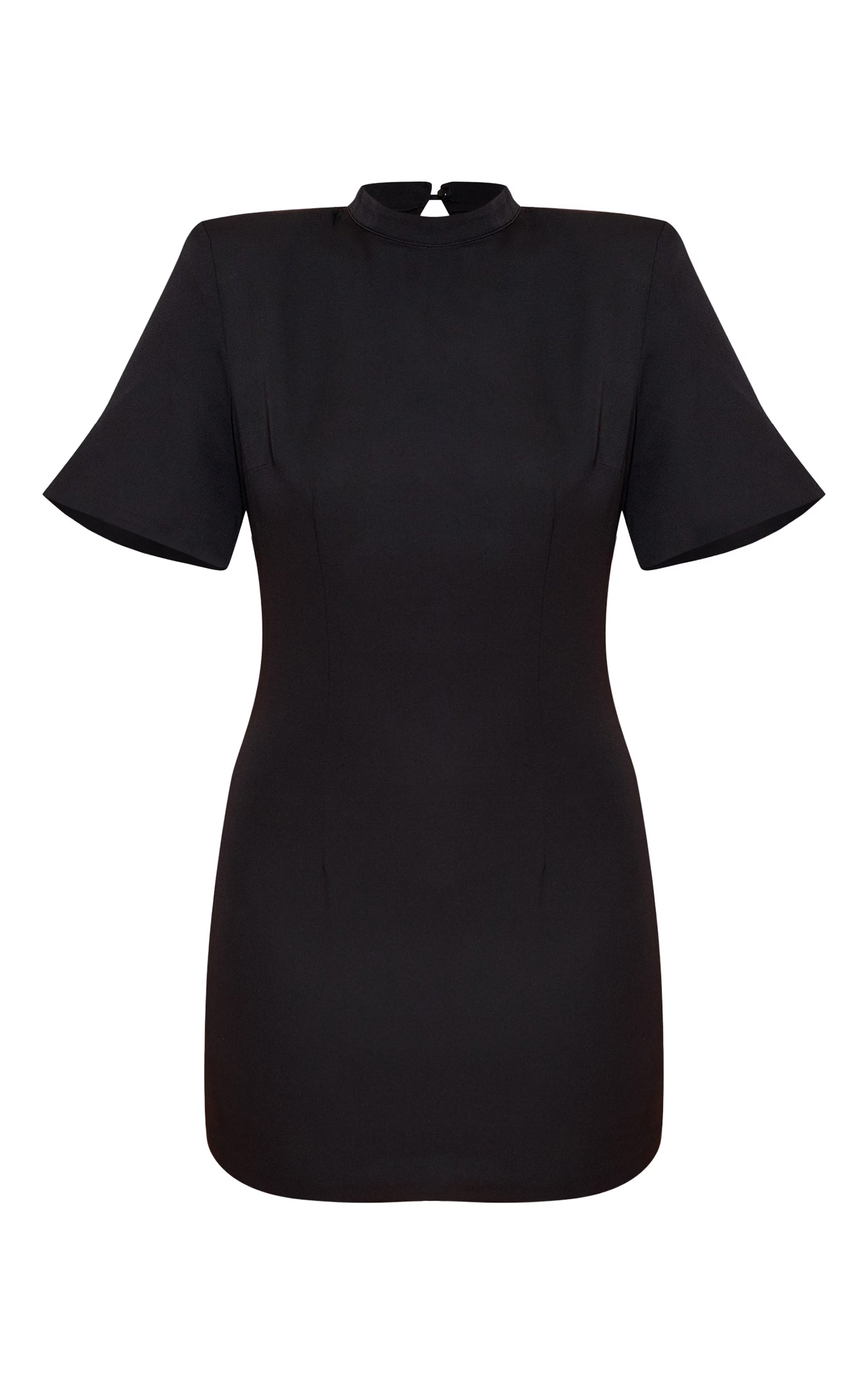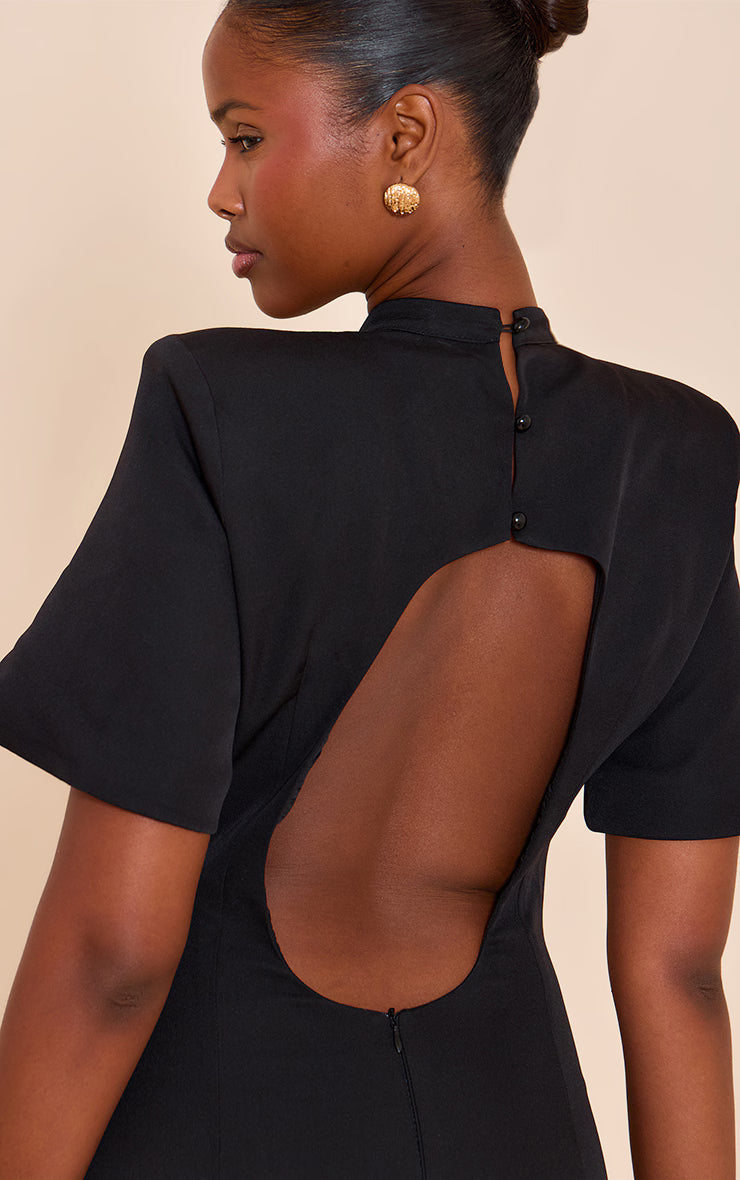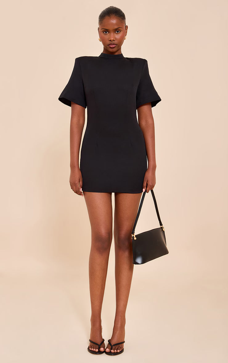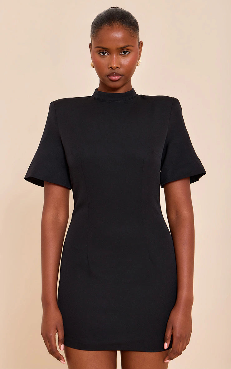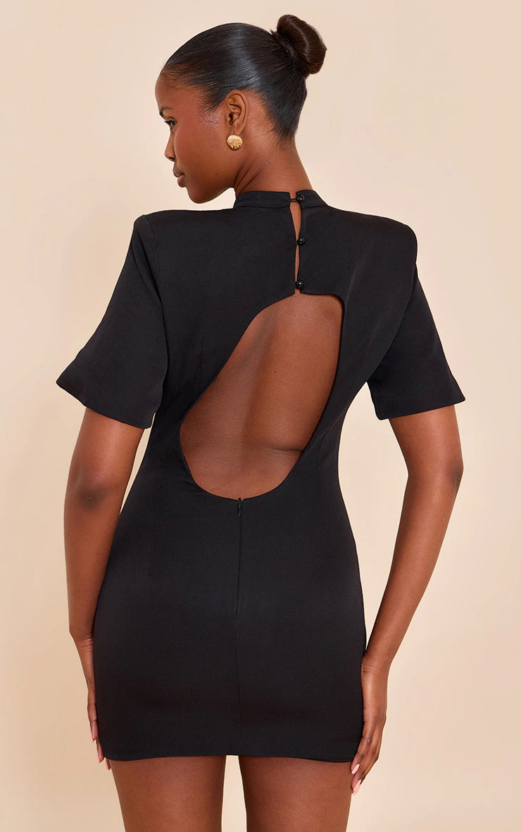 It's the unexpected detail that elevates everything. The black woven cinched backless mini dress delivers impact from every angle, crafted from structured woven fabric that holds its shape. Featuring a high mock neckline, sharp shoulder line, and mini length, this dress cuts a knowing shape before revealing the cinched backless design for a modern twist. Ready for evening, just add sharp heels and a clean-lined clutch to master the moment.