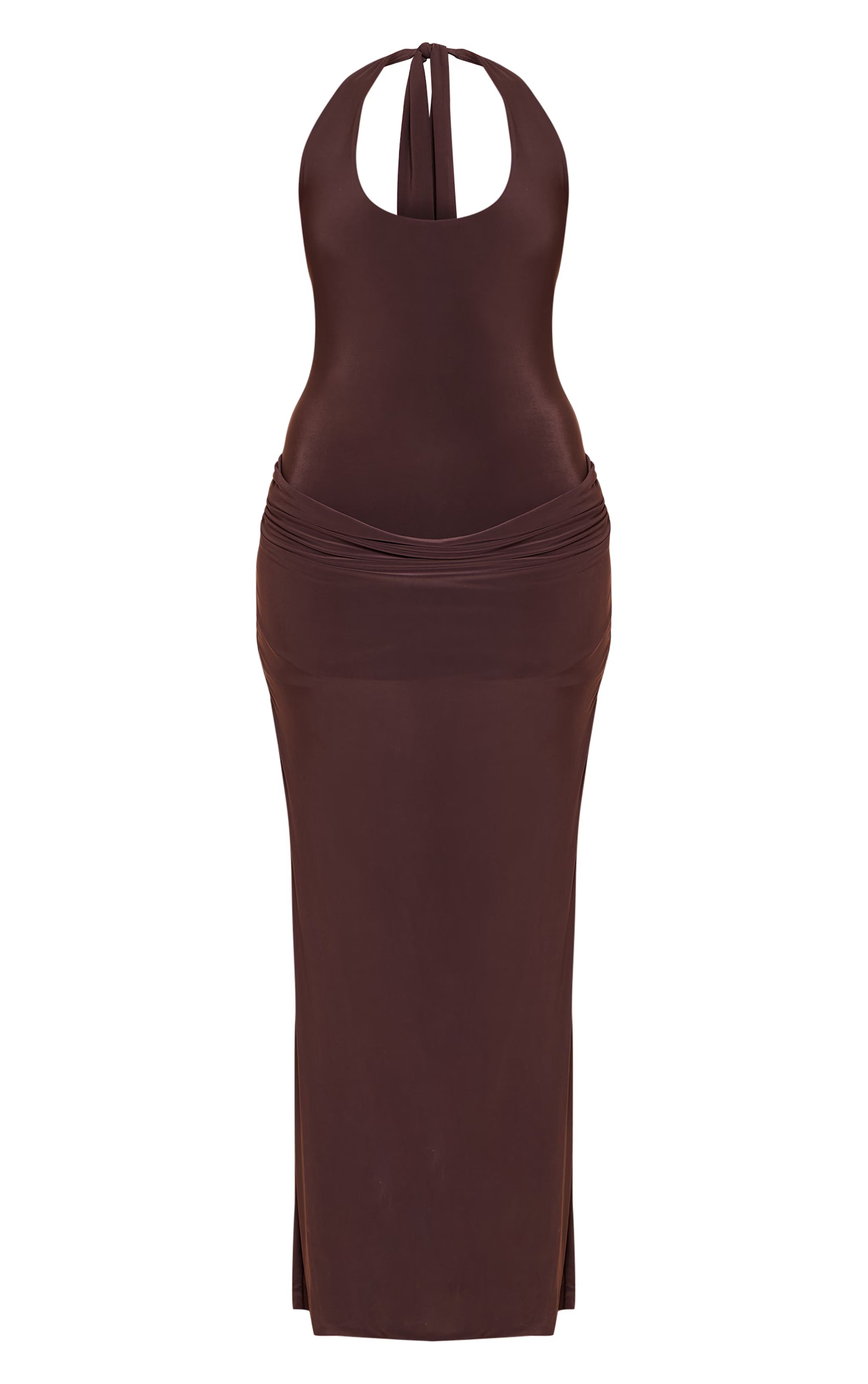 Chocolate Slinky Halterneck Ruched Detail Maxi Dress