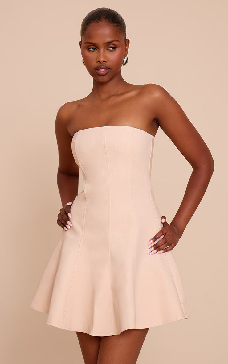 Step into elegance with the cream woven bandeau shift mini dress. Crafted from a structured woven fabric, this mini dress features a sleek bandeau neckline and a flattering shift silhouette. Pair with strappy heels and a clutch for a sophisticated evening look.
