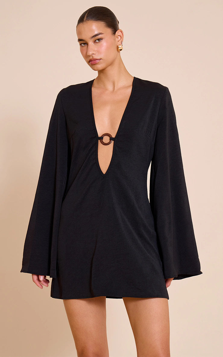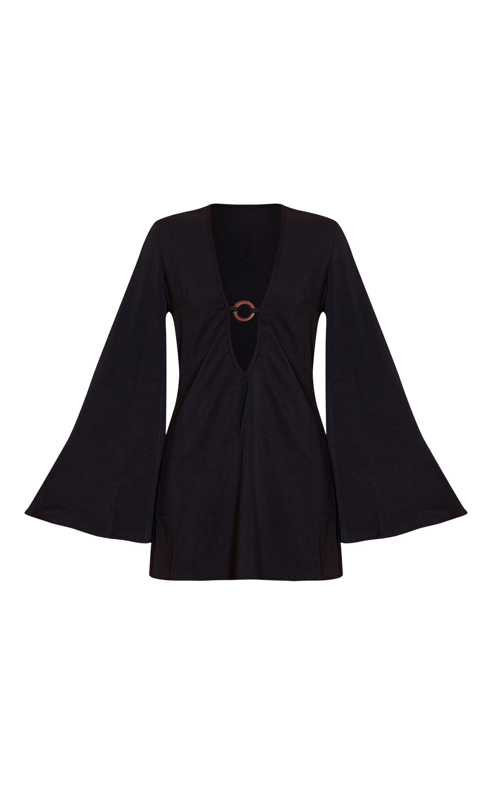 Black Floaty Woven Plunge Ring Detail A Line Mini Dress