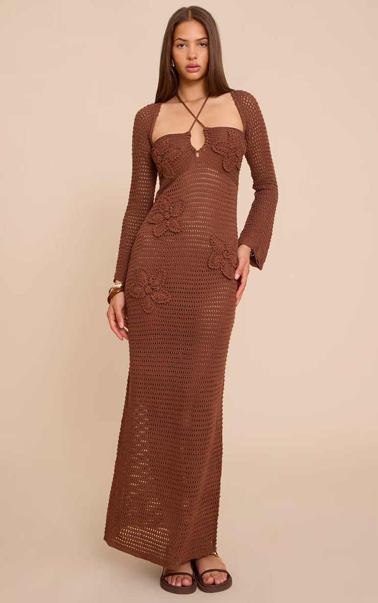 Chocolate Flower Applique Long Sleeve Crochet Maxi Dress