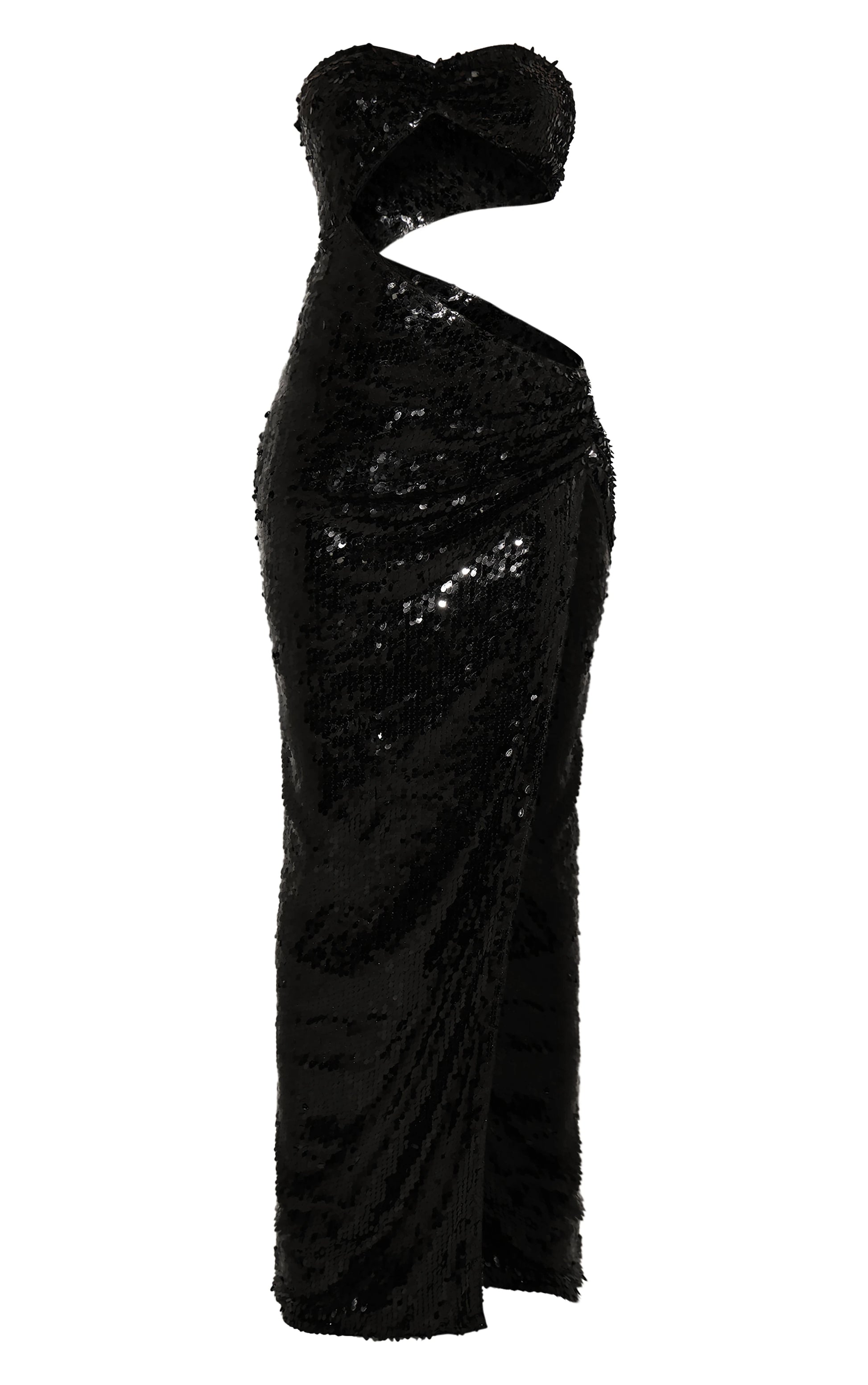 Consider this your after-dark style directive: the black sequin maxi, engineered for moments that demand considered impact. Sculpted with precision, the extreme cut-out design lends a subversive edge to the classic column silhouette. The high-shine sequin finish catches light with every movement, promising a mesmerising effect. Elevate the after-dark mood with a sculptural clutch from our accessories collection, a study in understated artistry.