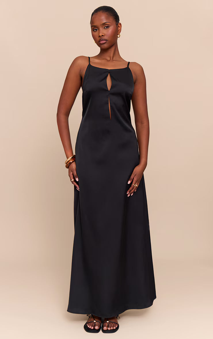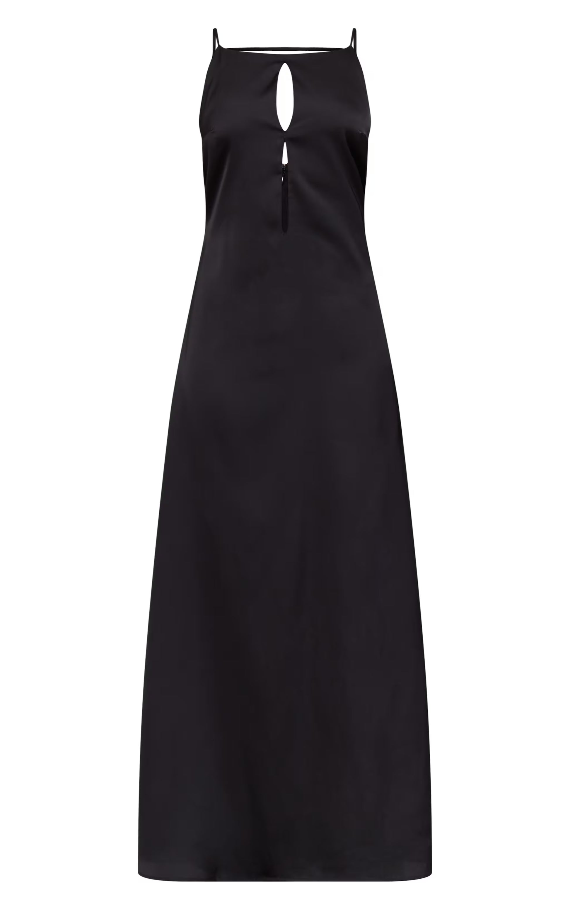 Own the evening in this black satin keyhole cut out slip dress. Crafted from glossy black satin material with delicate keyhole cut out details and a sleek slip shape, this dress brings effortless glamour to your wardrobe. Pair this dress with sandals and statement bangles for a flawless night-out look.