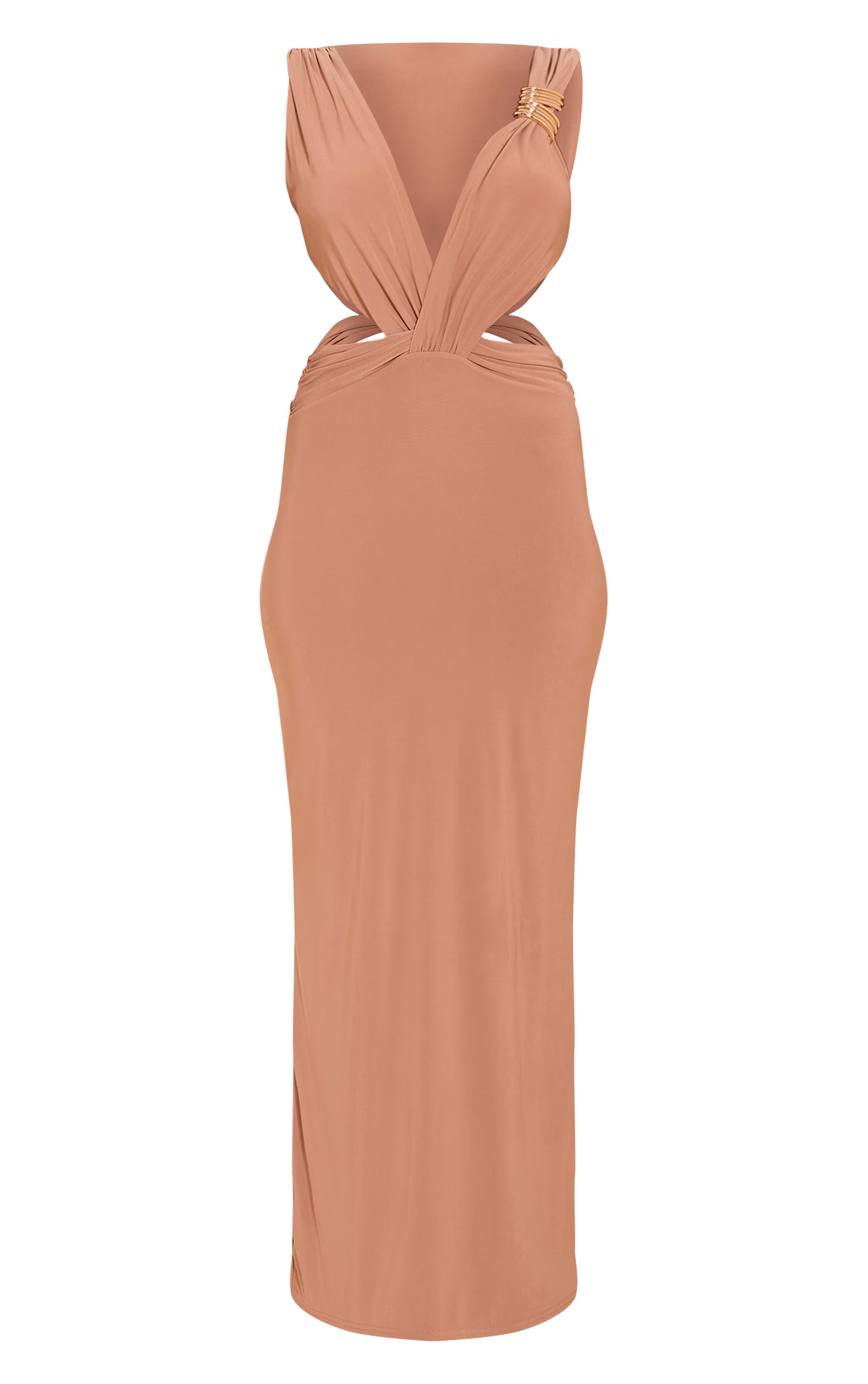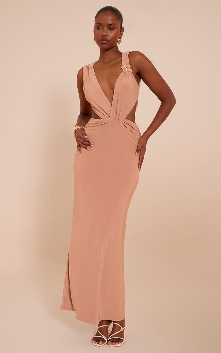 Beige Double Layer Slinky Plunge Cut Out Maxi Dress