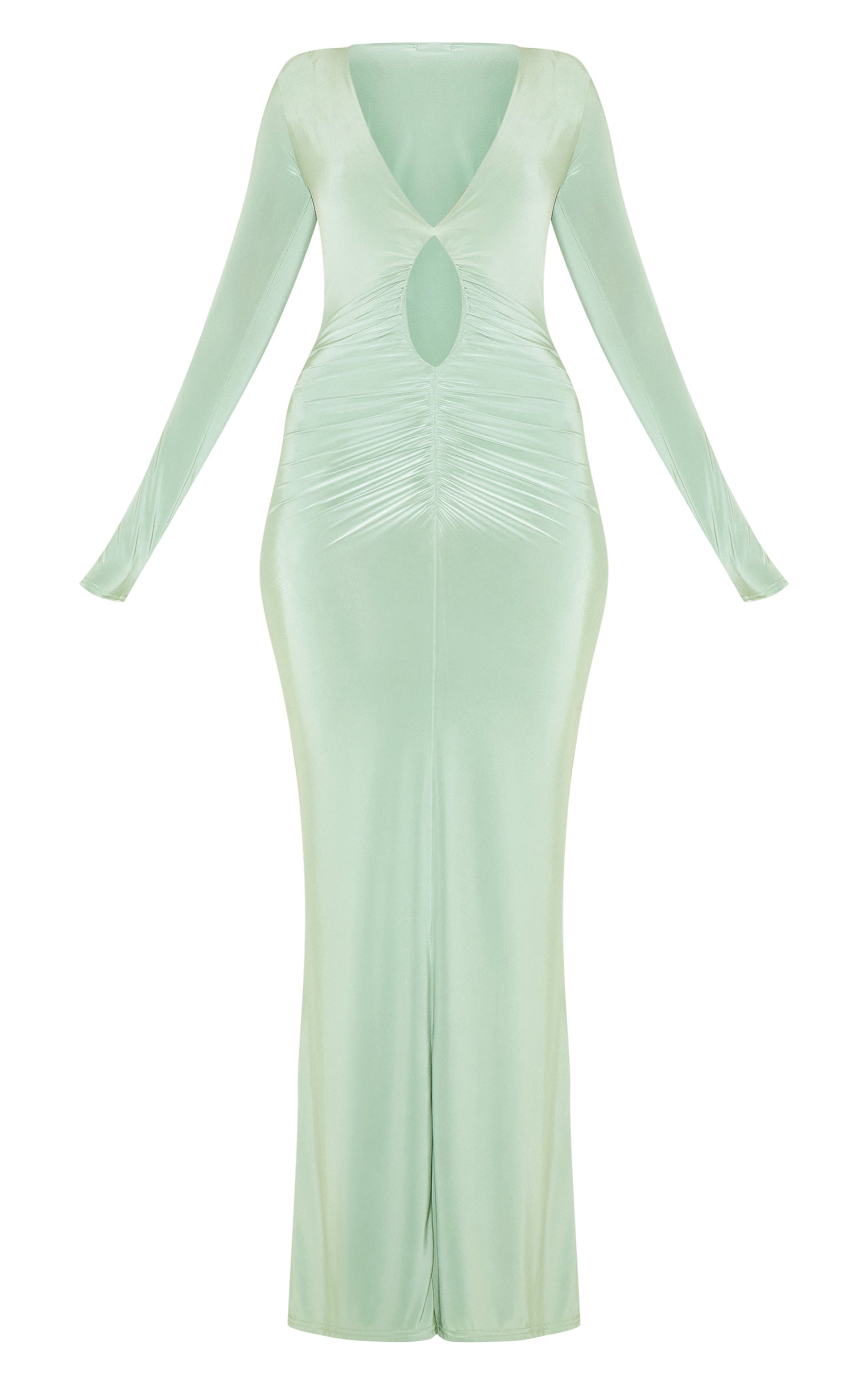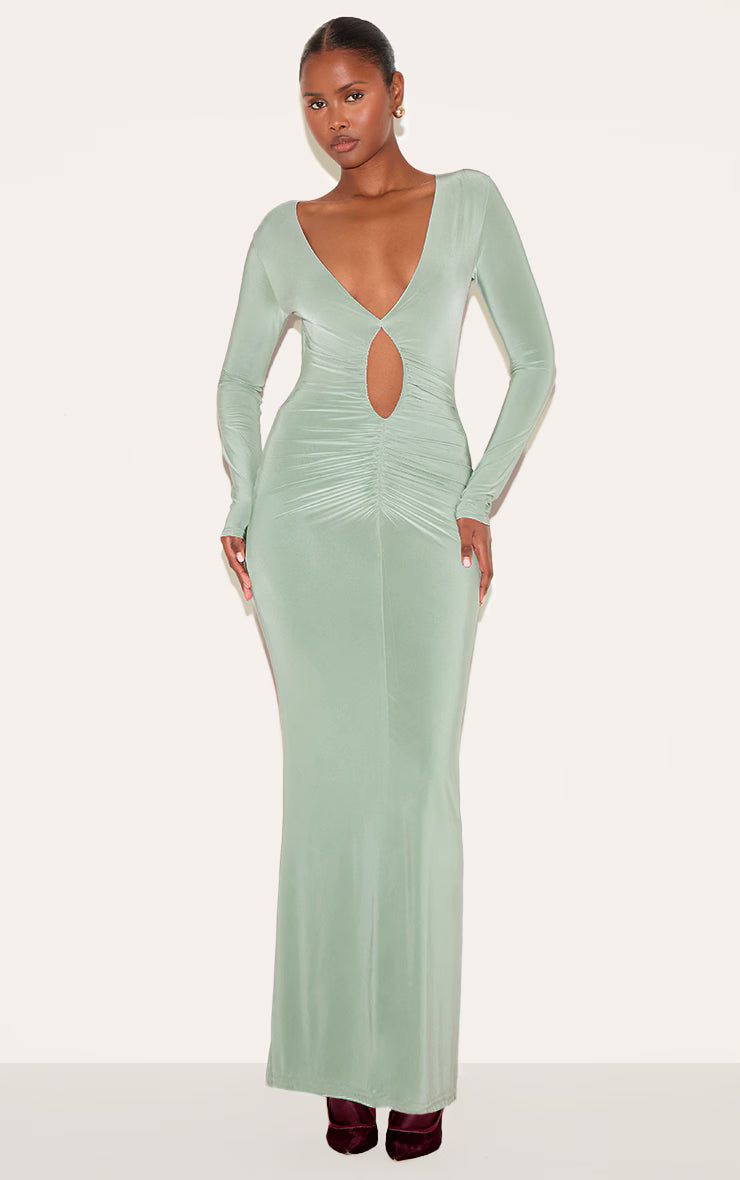 Crafted from a sage green material with a double layer design, a plunge ruched detailing and a maxi length. Team this sage green double layer plunge ruched maxi dress with a pair of strappy heels and your go-to accessories to finish off the look we are loving right now.