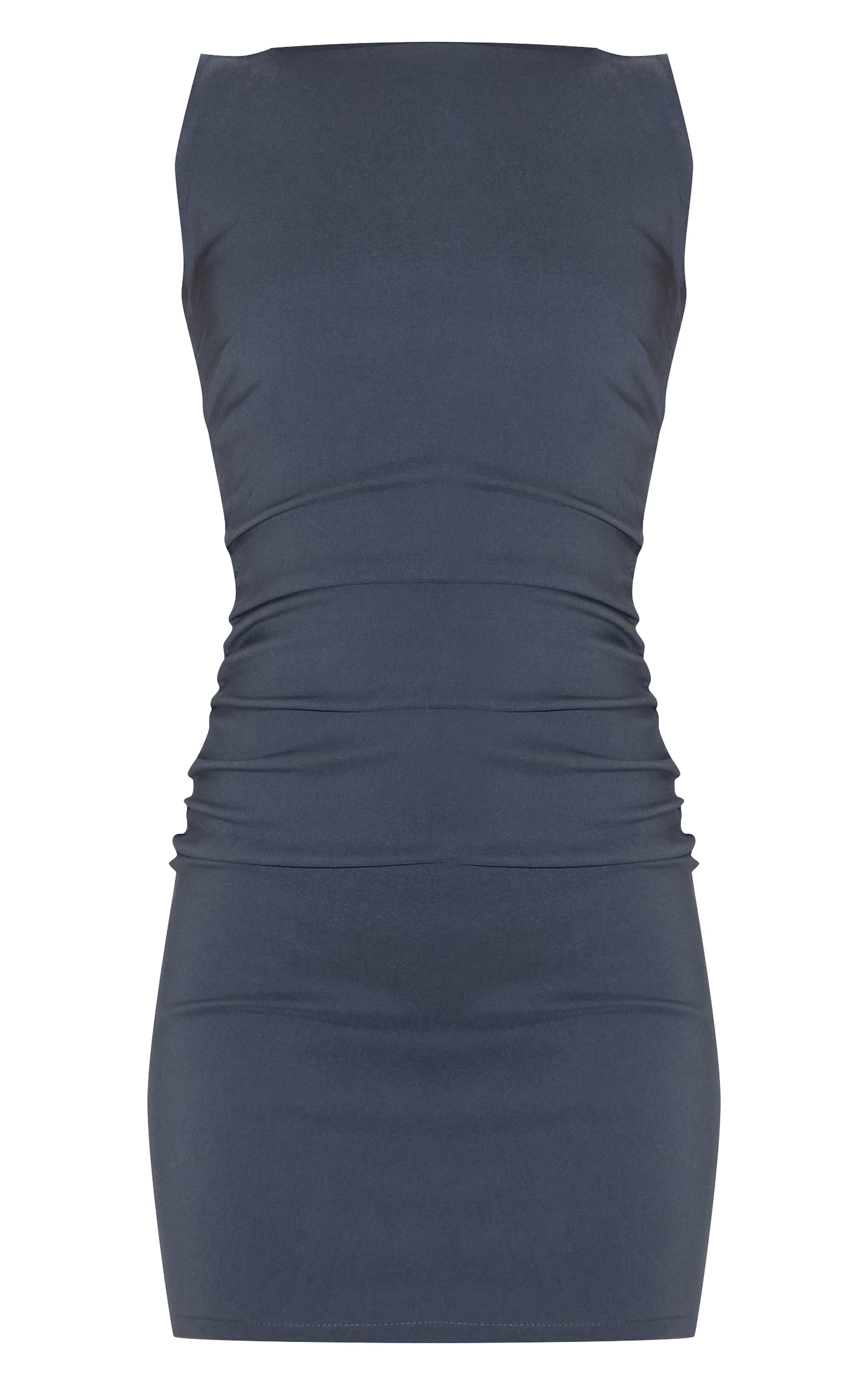 Find your form in charcoal. The charcoal stretch woven boat neck ruched detail bodycon dress presents a precise silhouette, cut with a clean boat neckline and sleeveless design. Strategic ruching creates an artful texture that shapes through the body, leading to a confident mini length. Layer yours under a sharp blazer and add minimal mules, or keep it simple with curated accessories for an effortless day presence.