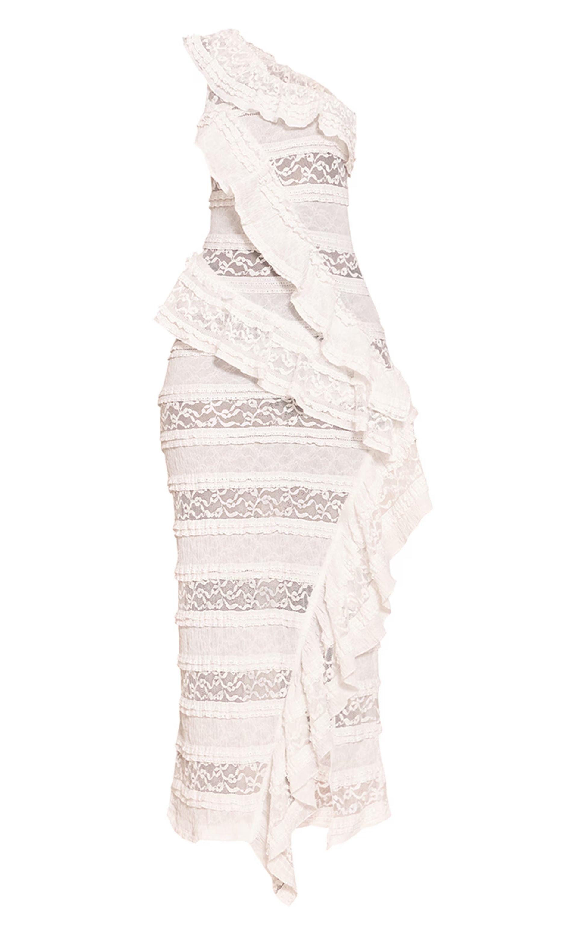 Turn heads for all the right reasons in this white lace frill detail one shoulder maxi dress. Brought to you in chic white lace, this dress has a one shoulder design, sheer panels and a maxi length fit. For a flawless finish, add thong mule heels and statement gold earrings.